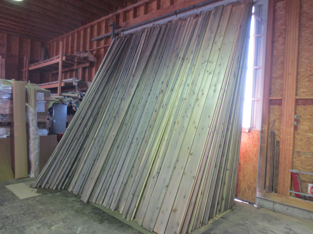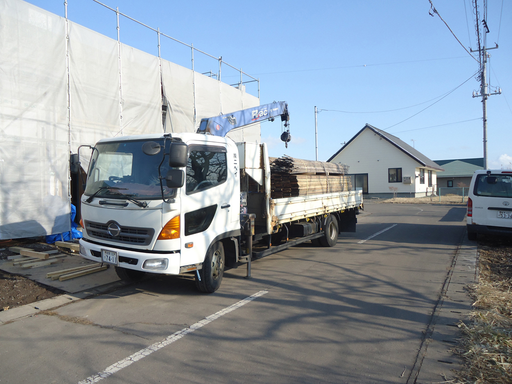 外壁の杉板が運ばれてきました。張りあがりが楽しみです。