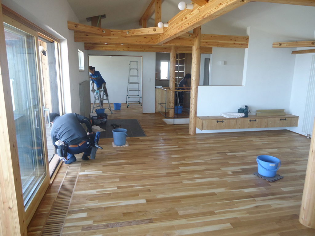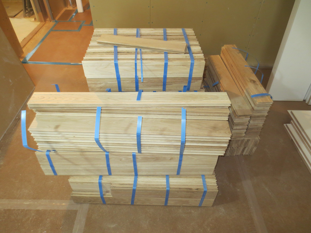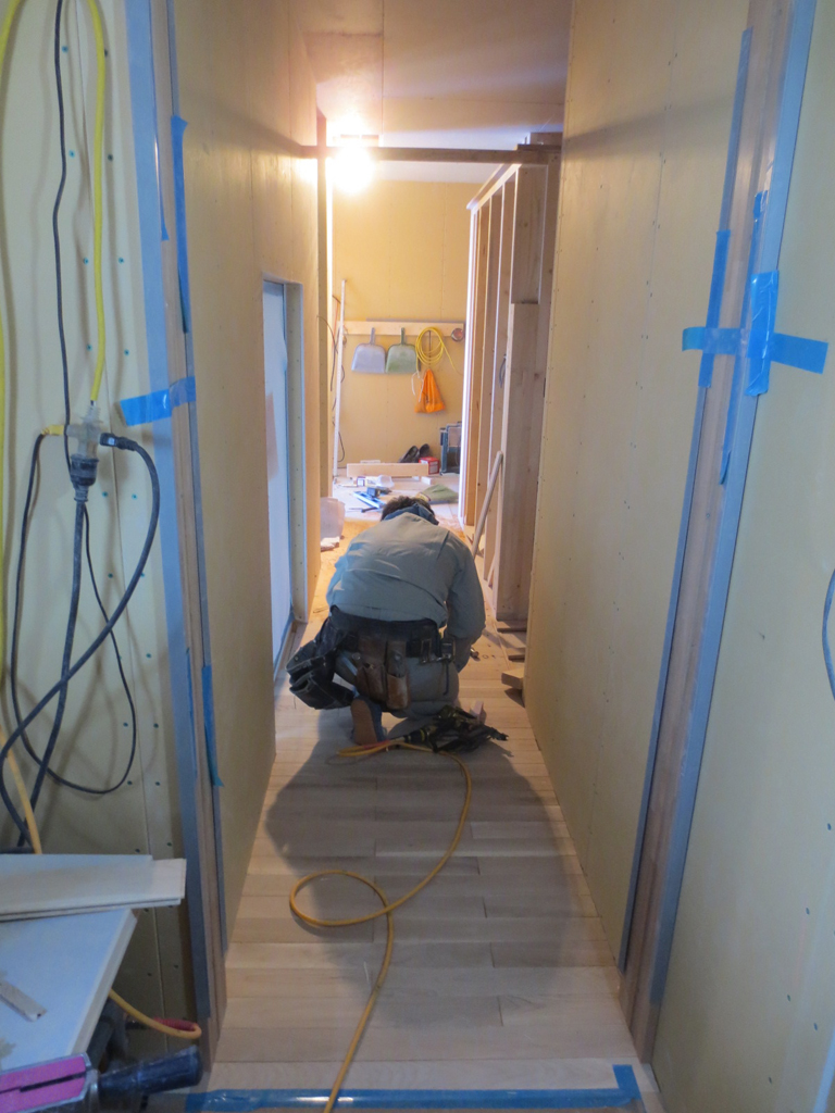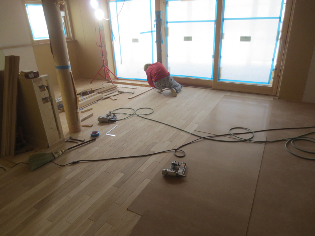 フローリングも入ってきました。今回はニレのフローリングを使います。