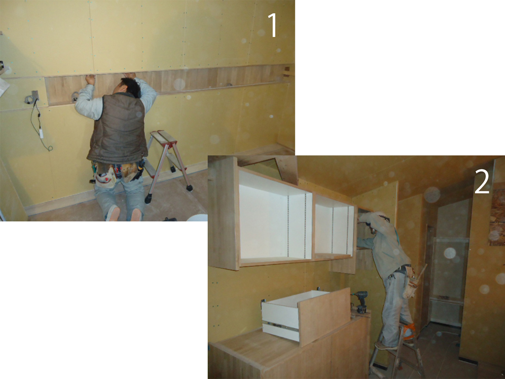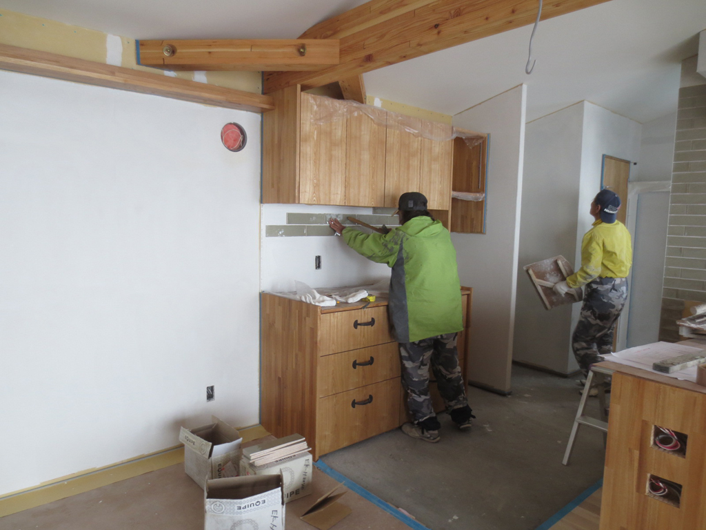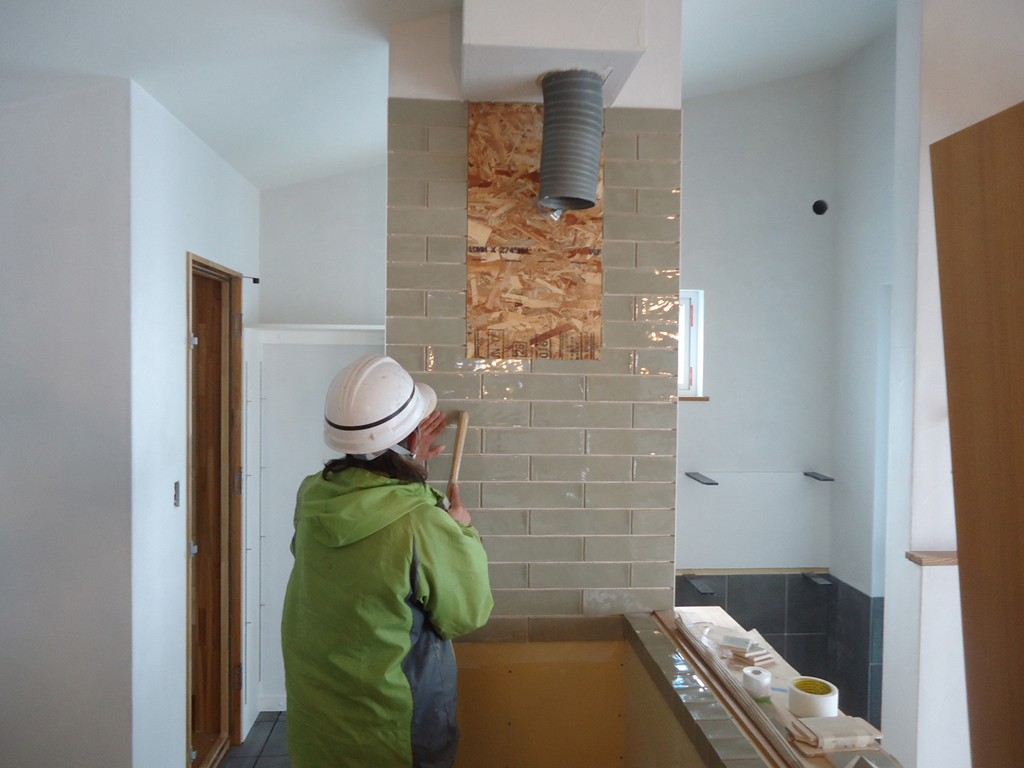 タイル屋さんも登場です。食器収納部分のタイルを貼っています。