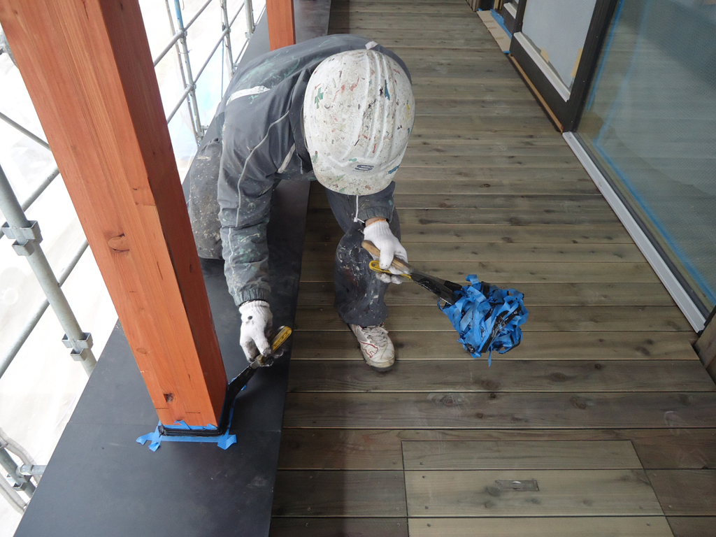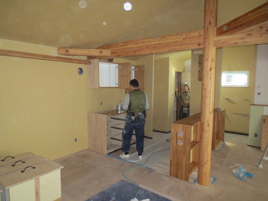 現場では塗装屋さんが乗り込んできて、家具や建具の塗装をしてます。