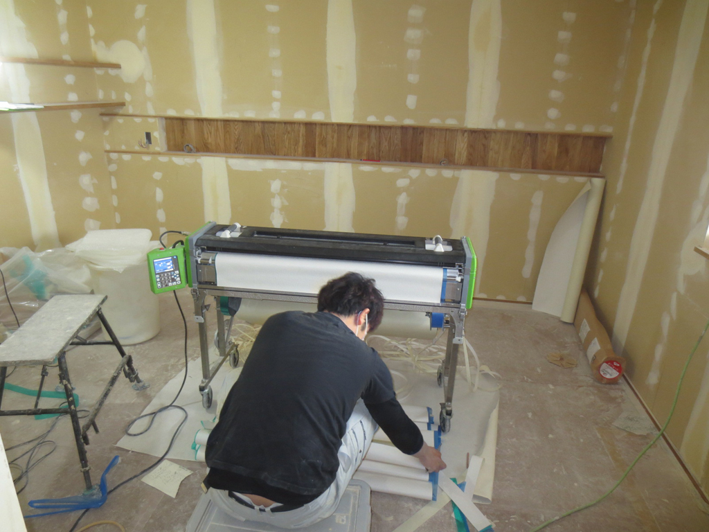 クロス屋さんが糊付機を使って、各部屋の大きさに合わせてクロスを裁断しています。