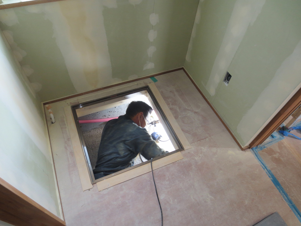 床下に潜って給水や暖房の配管を行っています。床下は高いところでも45㎝位なので