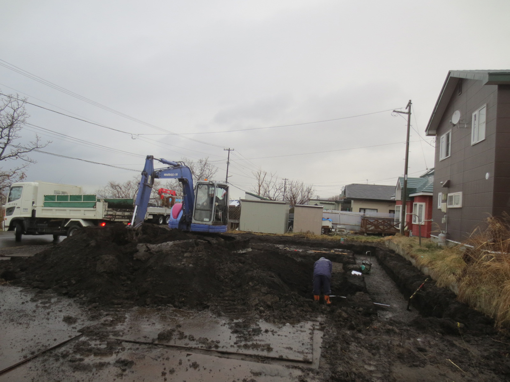 冬場の基礎工事になるので、掘削が終わったら養生上屋を架けます。