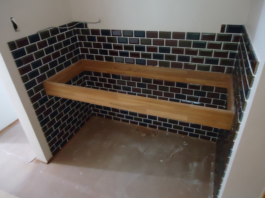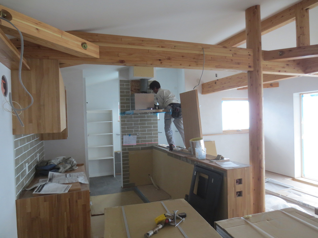 タイル屋さんもキッチン部分のタイル貼り終わり、目地(タイルの隙間)の調整中です。