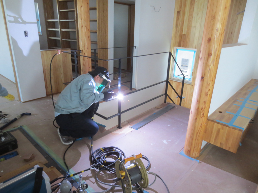 こちらはサトウ工業のS田さん。階段手摺の取付中です。