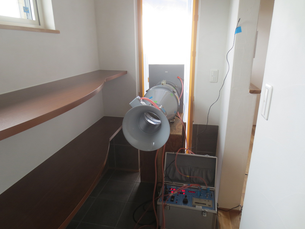 こちらの物物しい機械を使って空気を外に出しながら、建物の隙間面積を計測します。