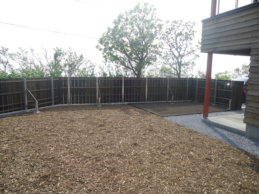 塀の仕事が完了してウッドチップを敷き込み、広々としたドッグランが出来ました。