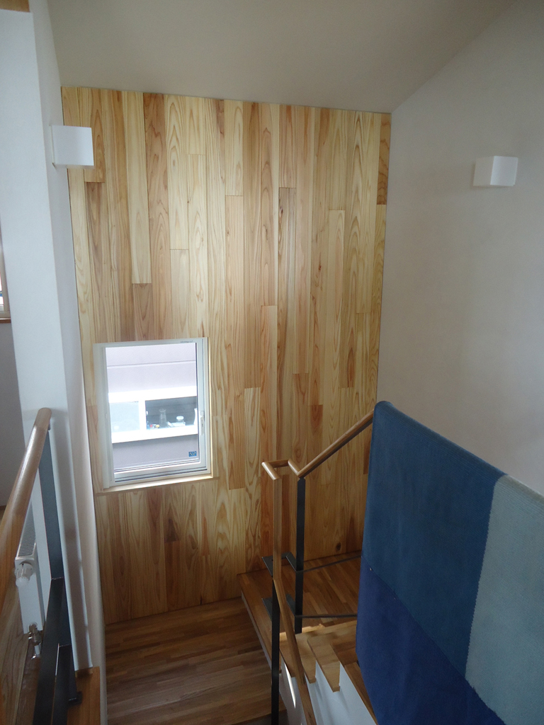 階段の壁にはご主人の出身地、秋田の杉板を張りました。