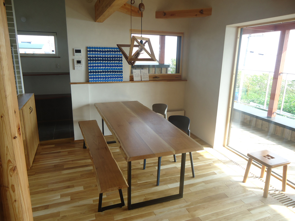 ダイニングテーブルとベンチも脚を取り付けて完成です。