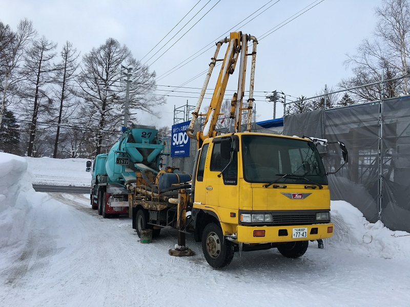 配筋チェックを終えると、生コン車とポンプ車が到着しベースコンクリートの打設です。