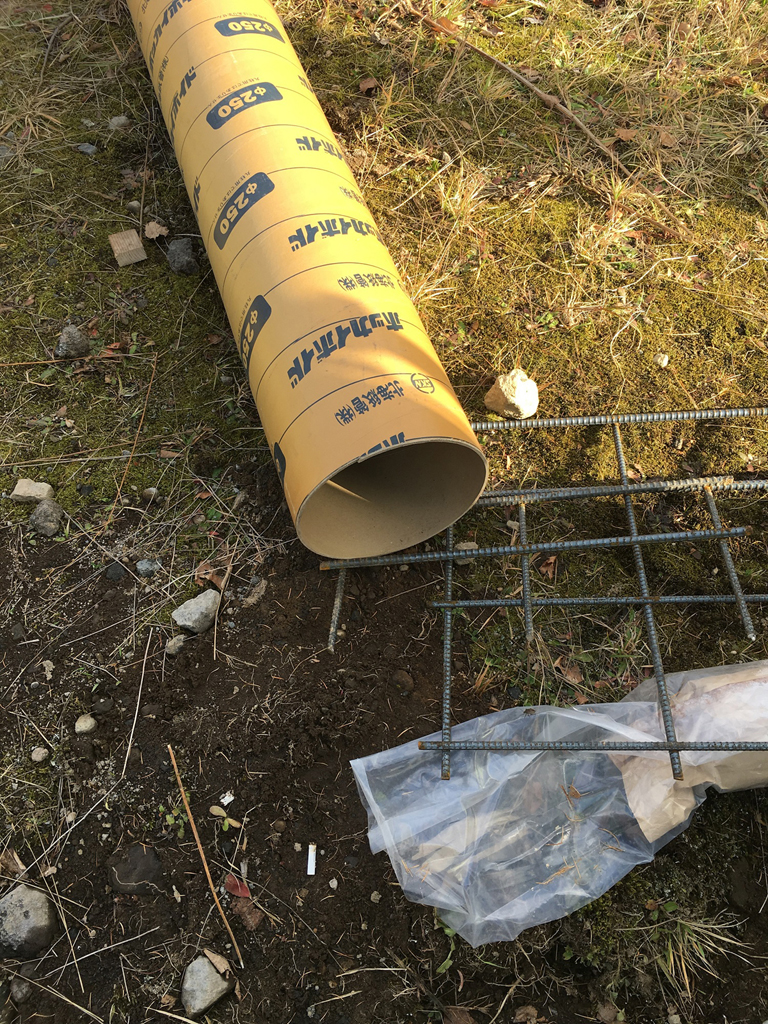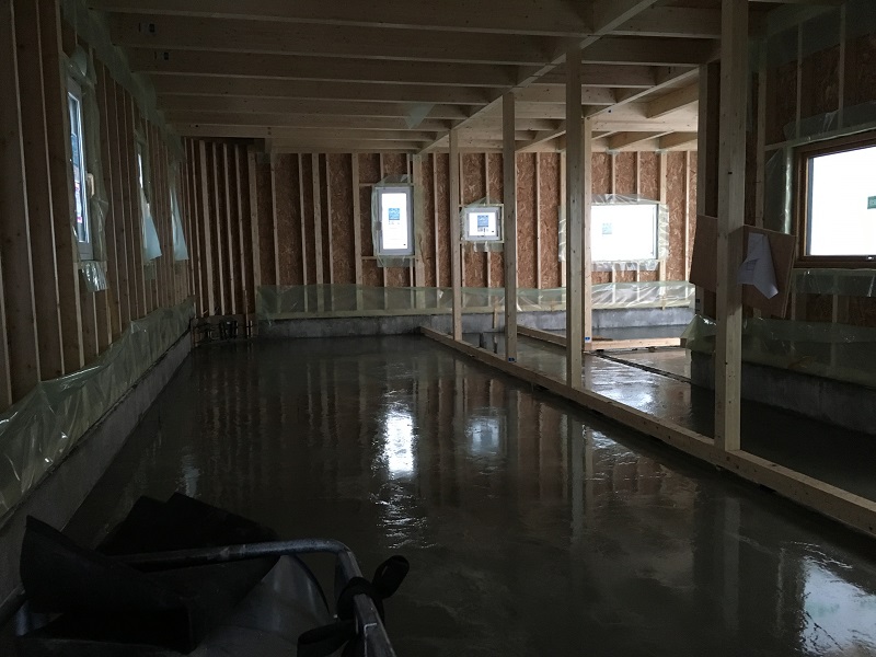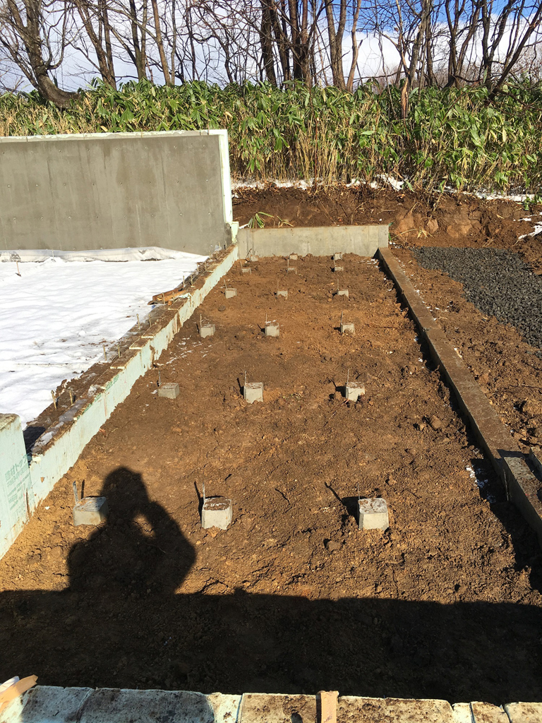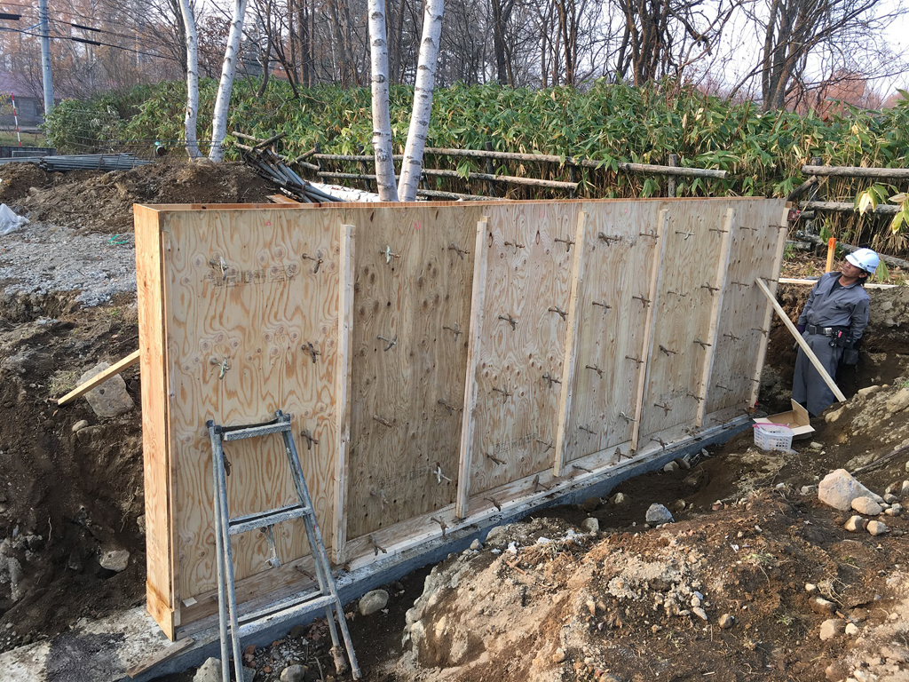 建物の外側に基礎を作り、トドマツの板を立てていきます!