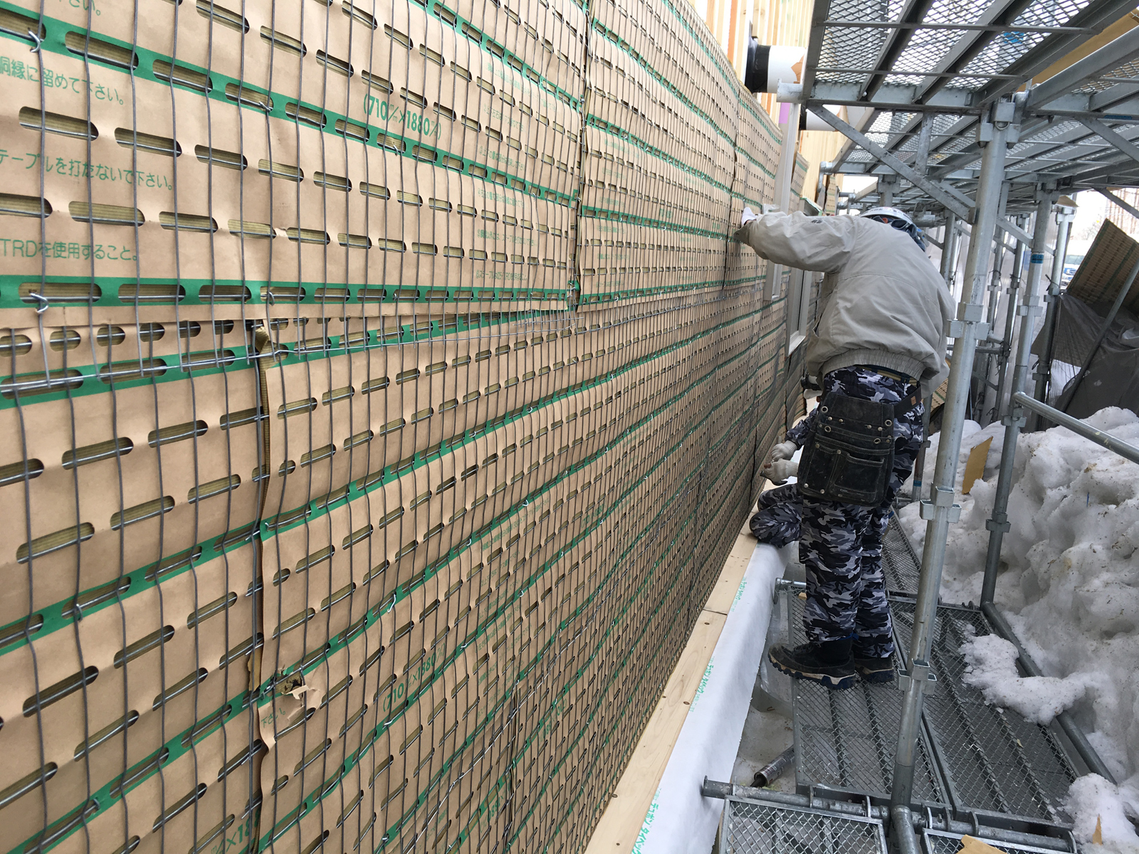 外壁のモルタル仕上げになる所の下塗り作業も完了していますので、順次仕上がっていきます。