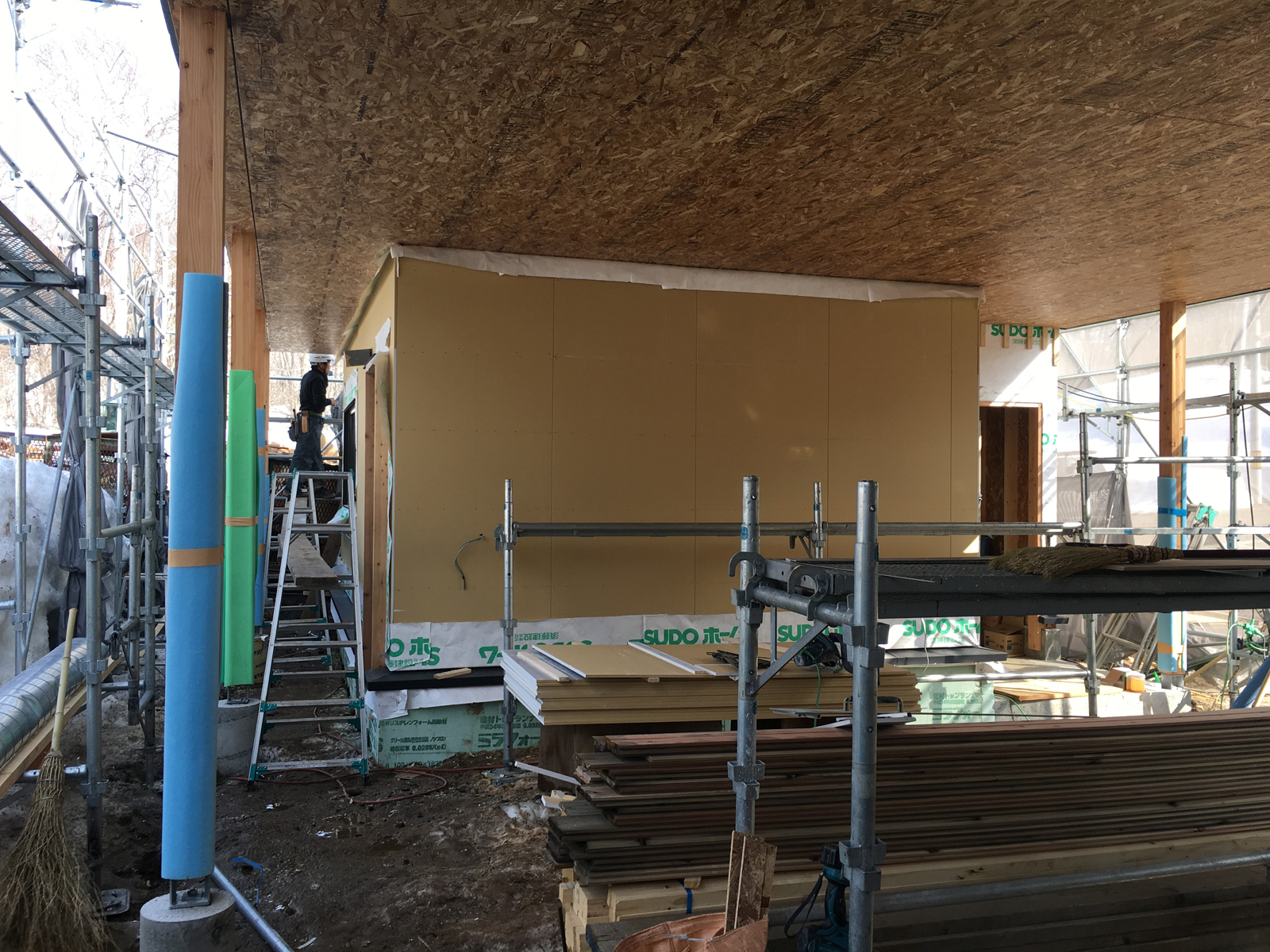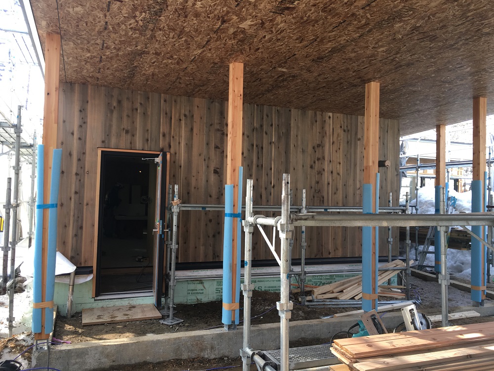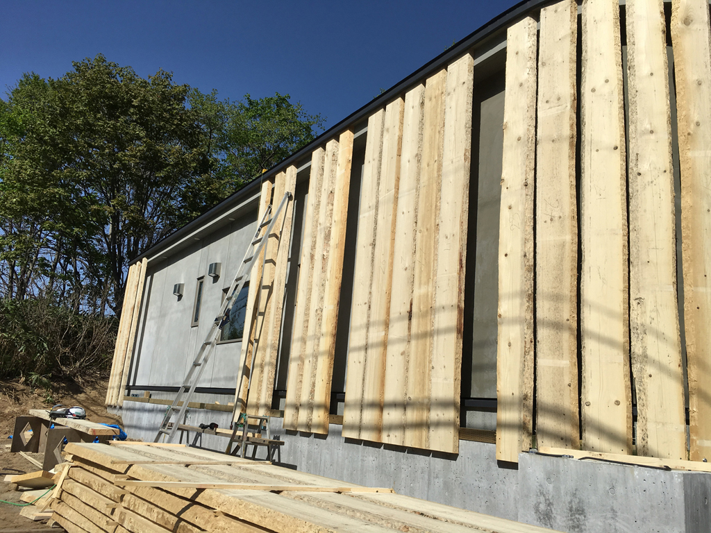 前回登場した、外壁に使う杉板の施工が完了していました。