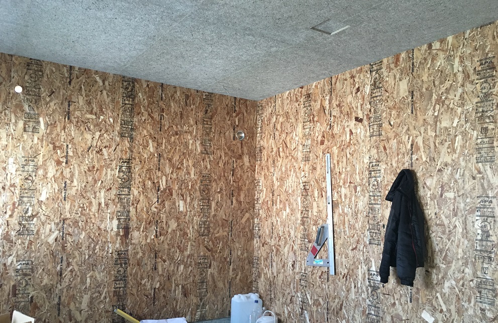 前回Oさんが言っていましたが、内部壁にOSBを使っています。