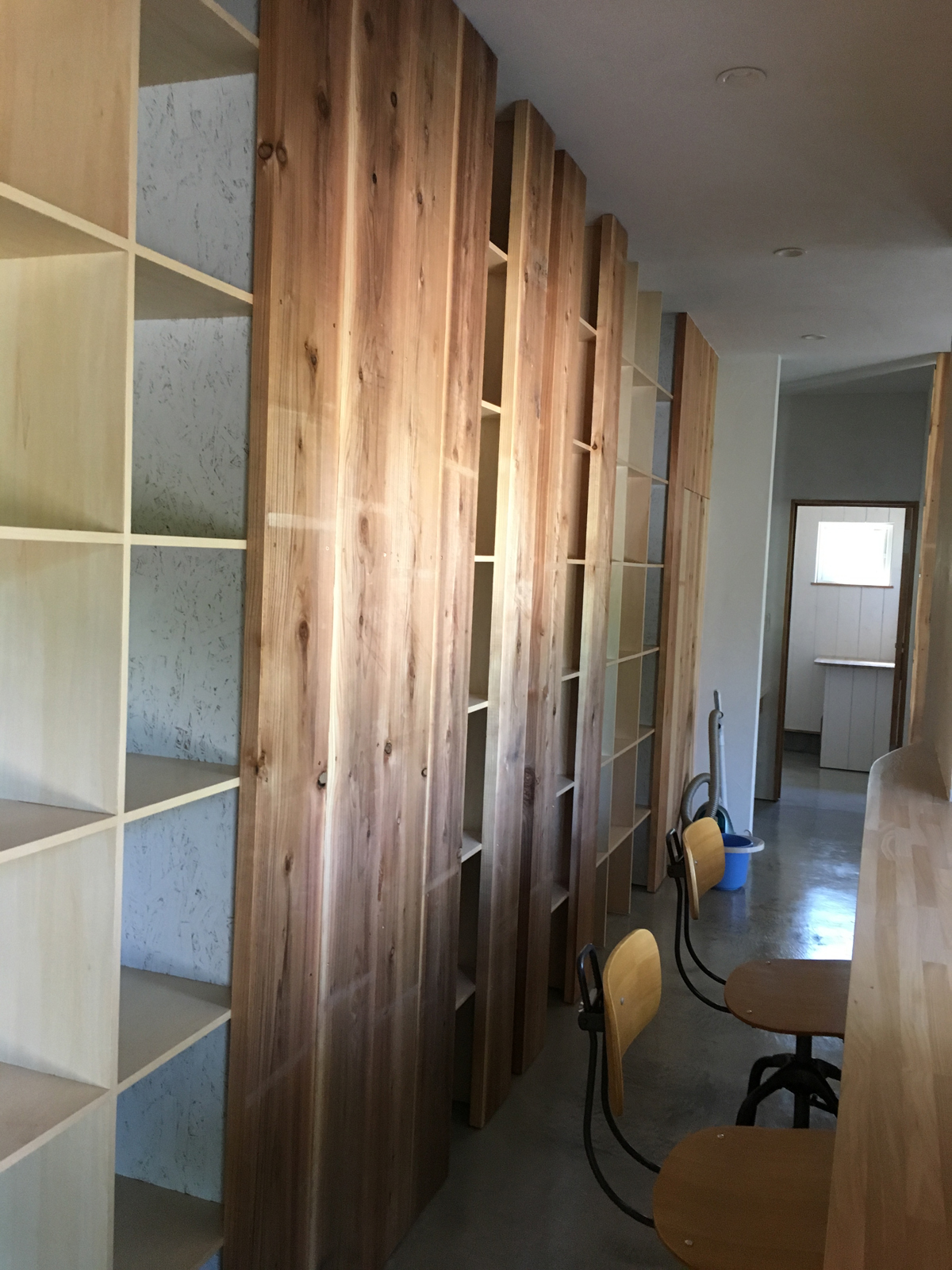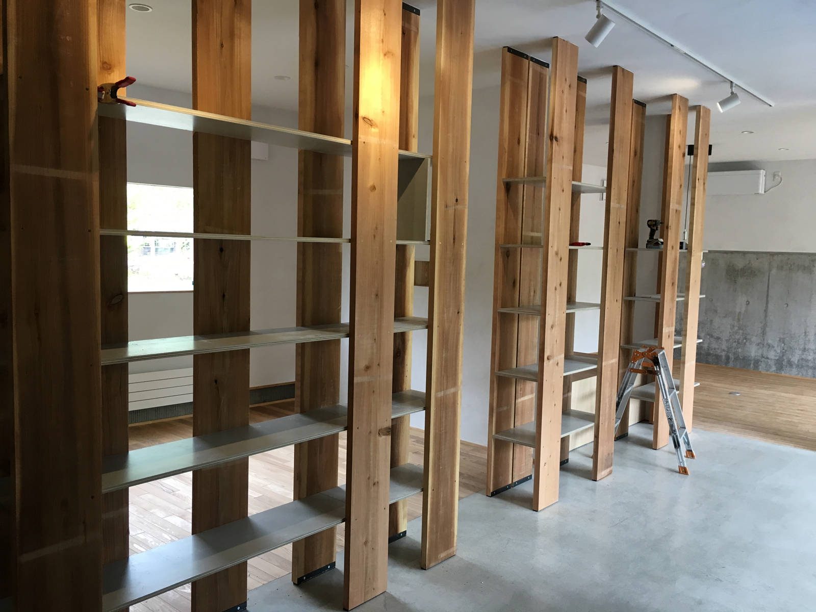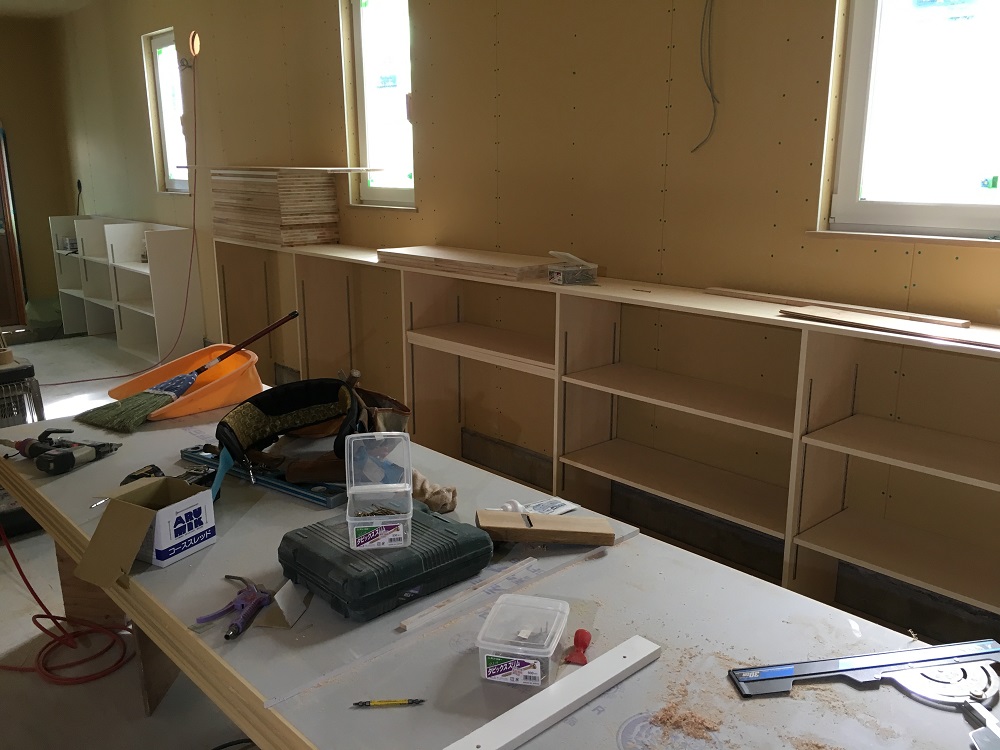 内部ではDーモン棟梁が奮闘して、棚を造っていました。