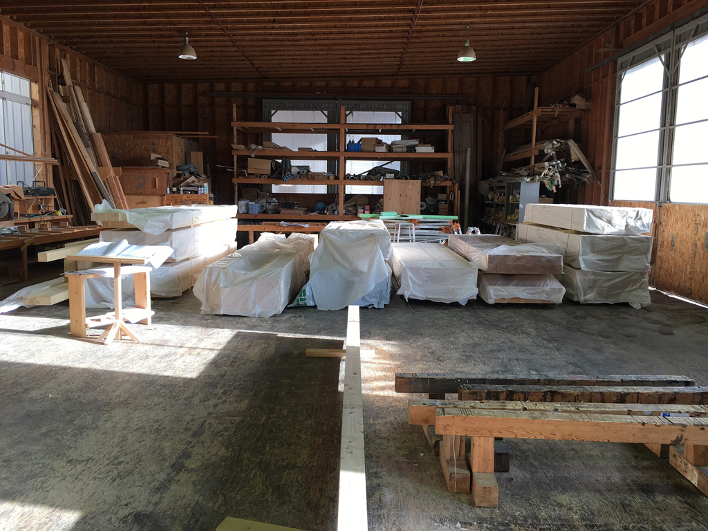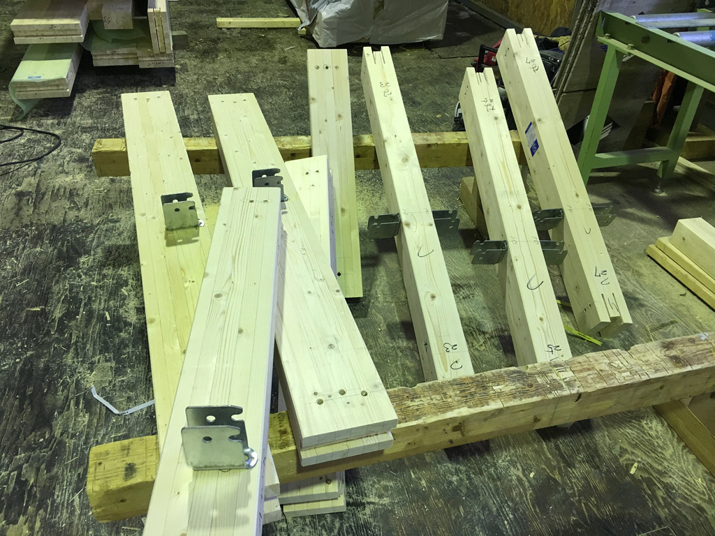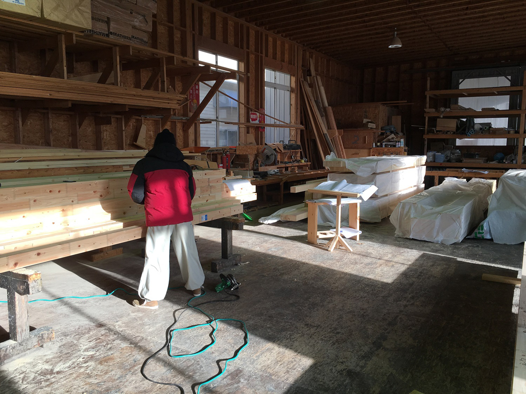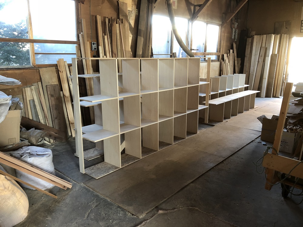現場から離れて、建具屋さんの工場を覗いてみると格子状の棚がありました。