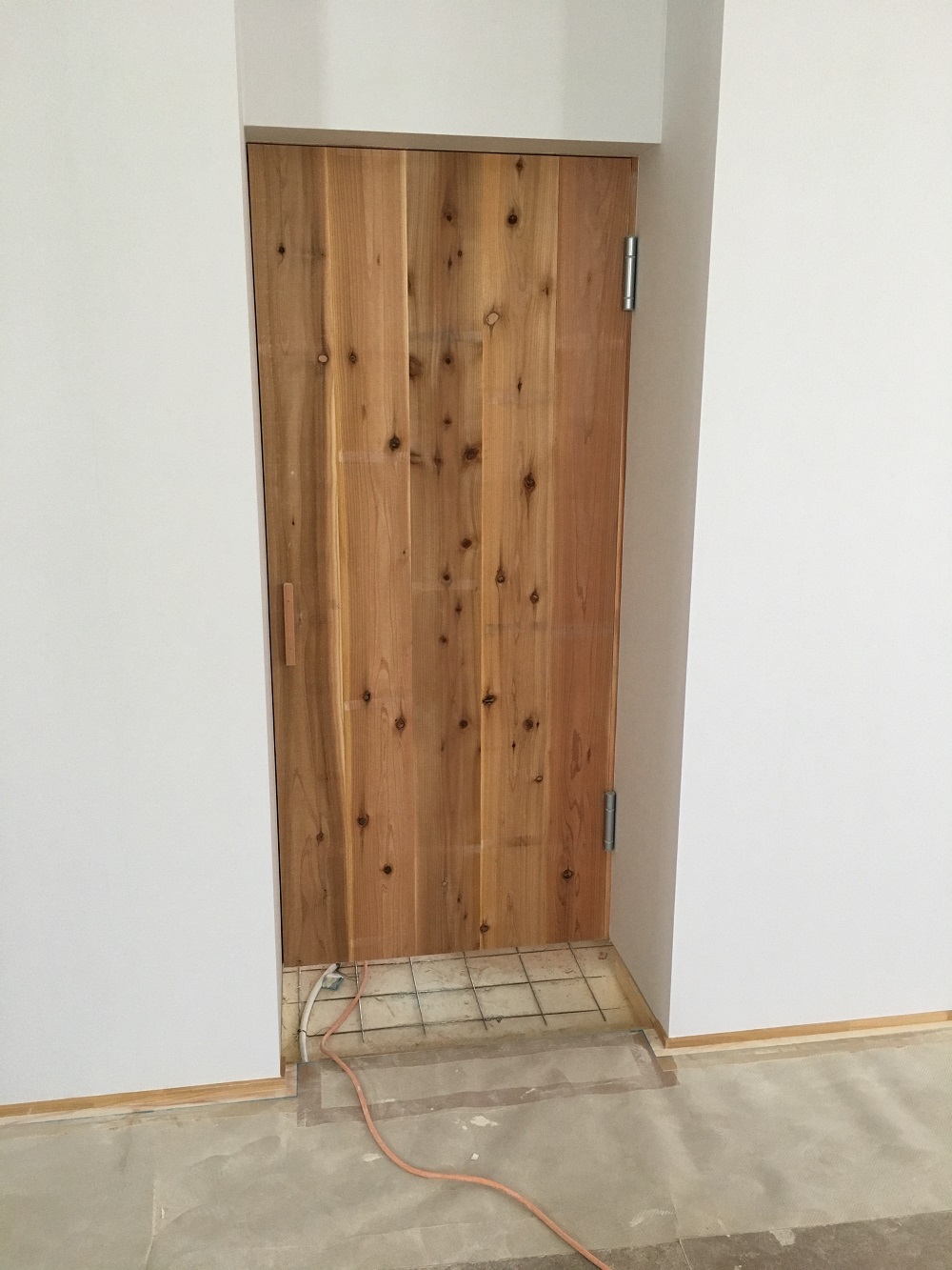 オフィスにつながる扉を壁の杉板と一体的にしているんです!