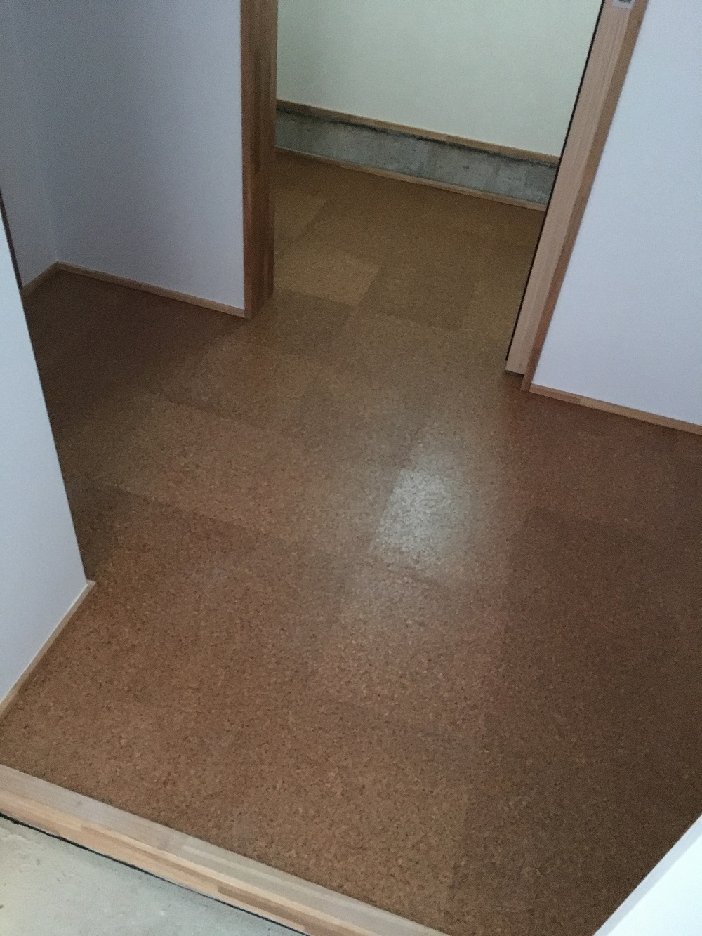 従業員の玄関スペース(一部)と、トイレの床はコルクタイル仕上げです。