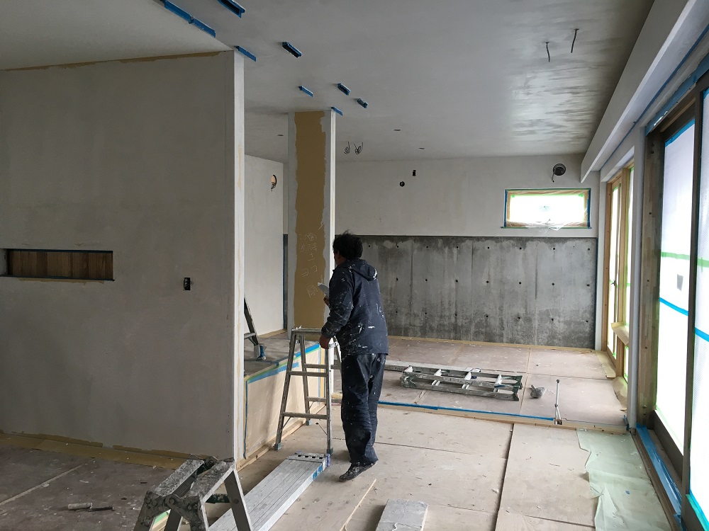 クロス屋さん、建具屋さんの作業が終わったので、お次は塗り壁の仕上げに入ります。