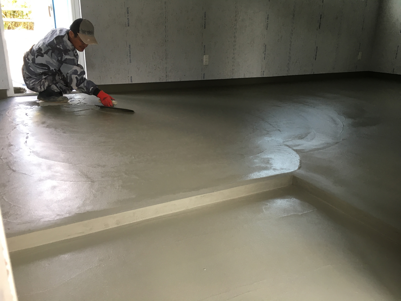 こちらはコンクリートの上に表面強度の高い仕上げ材を塗り、コテ波の模様をつけました!