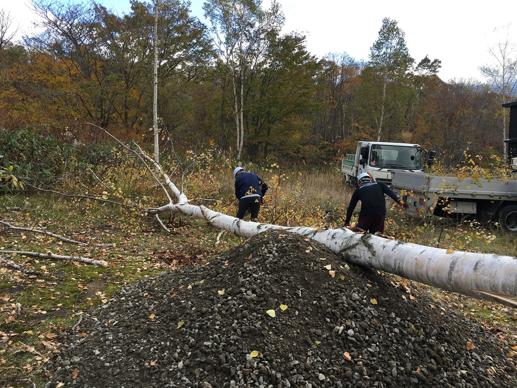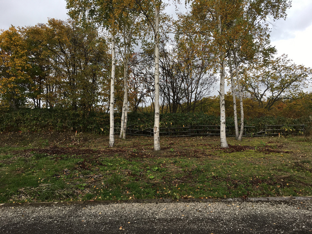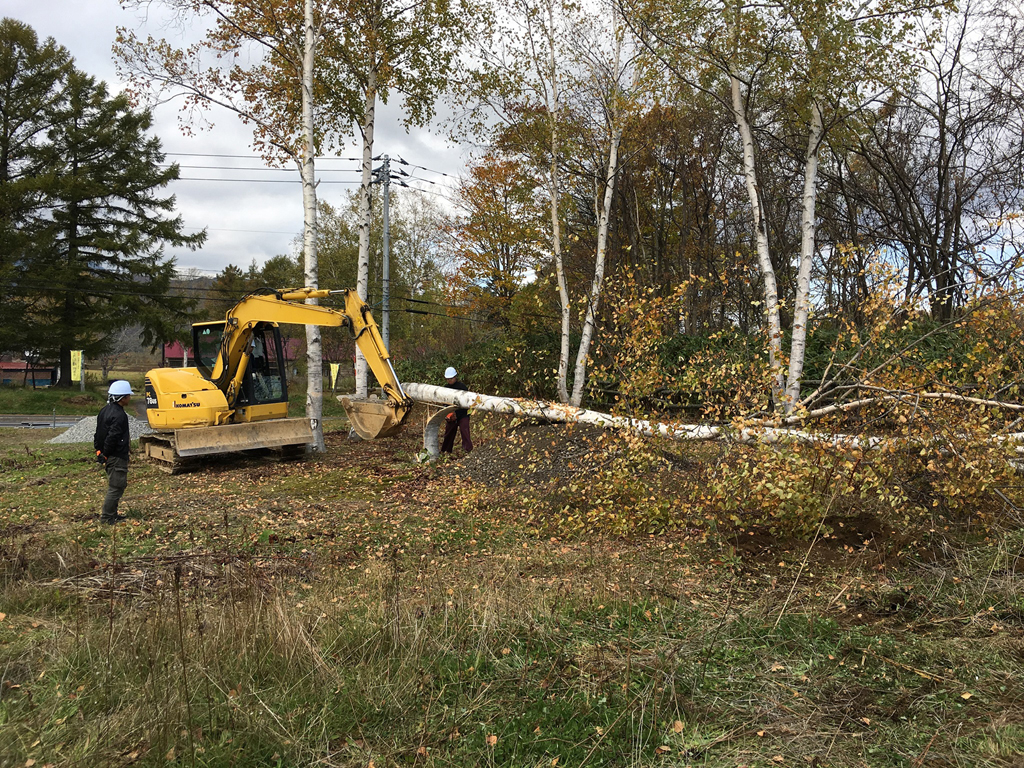 といきたい所ですが、敷地内に白樺の木が数本あり、そのうち3本が建物に干渉するので、まずは伐採から始めます。