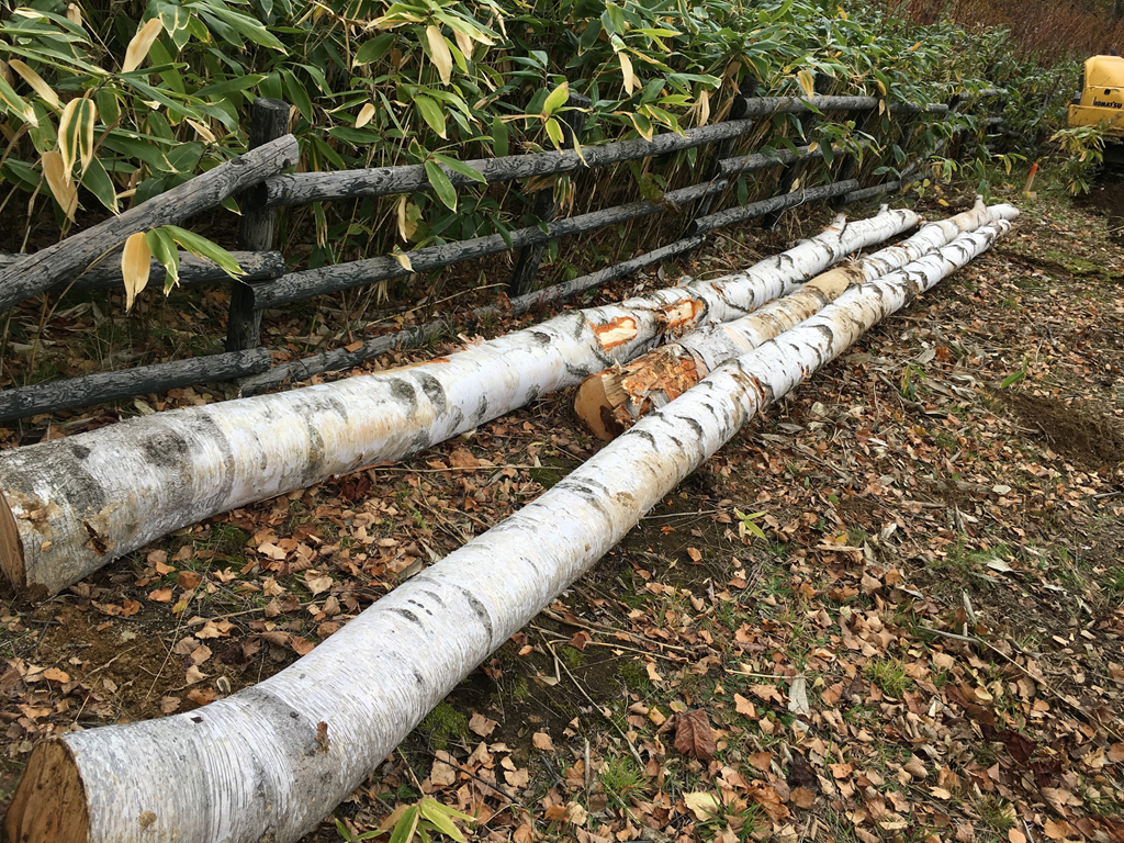枝払いされた白樺の木は後々何かに使うかもしれないので?敷地の端に寄せ、伐採作業完了です。