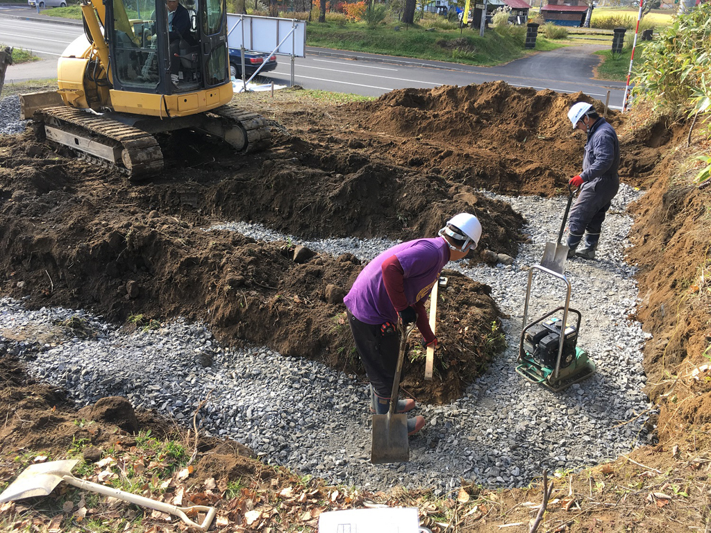 次に基礎のベース下の砕石を敷きならべ、ランマーで転圧していきます。