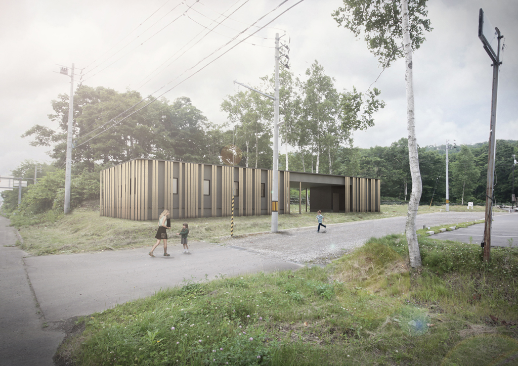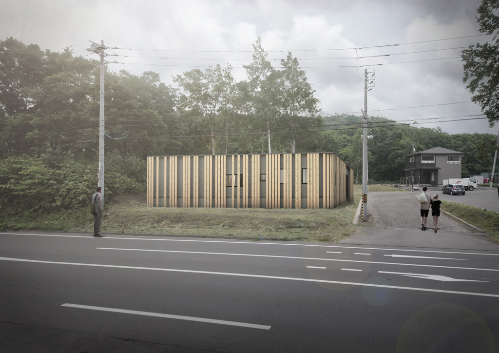 道路側は変則的な隙間をあけた木板で覆うことにより、まわりの自然環境に調和させつつ、インパクトを与えるファサードにしました。
