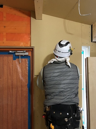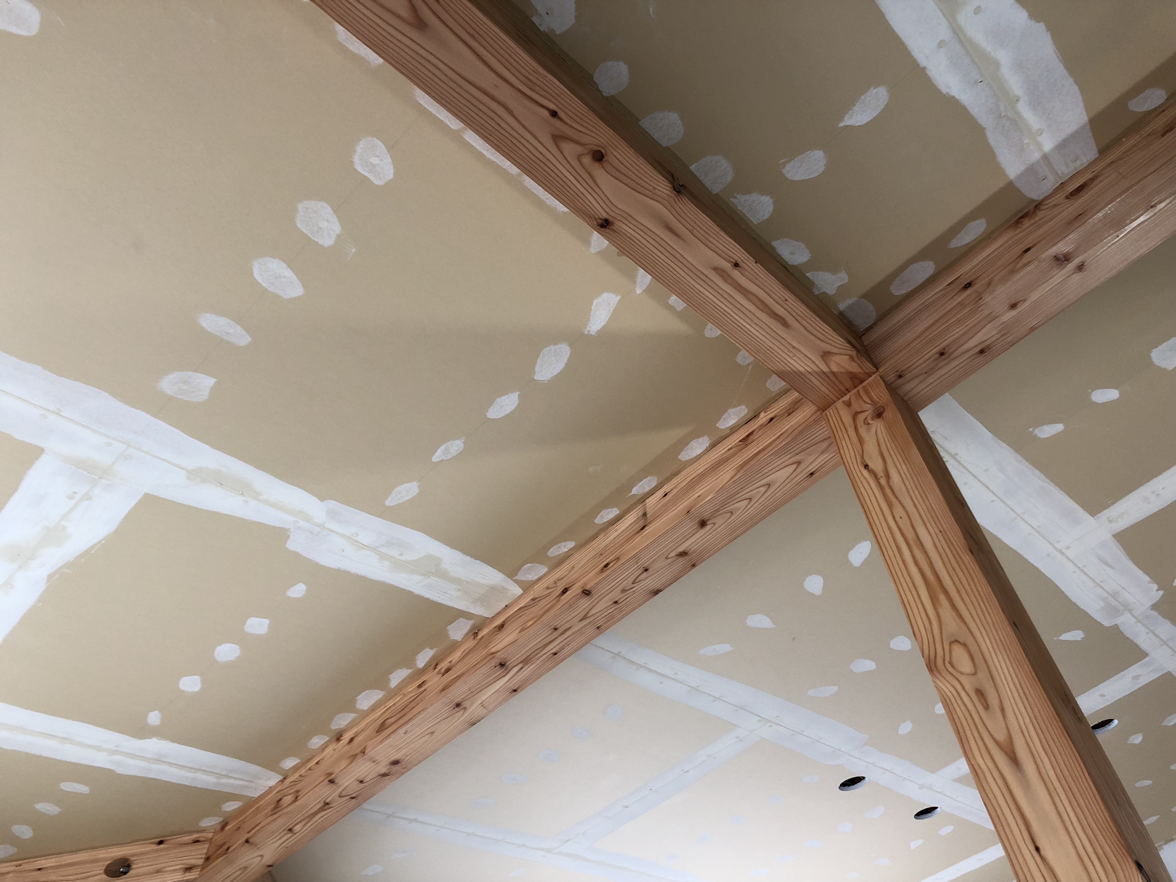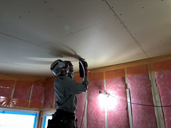 気密処理が終わり引き続き石膏ボードを貼っていきます。