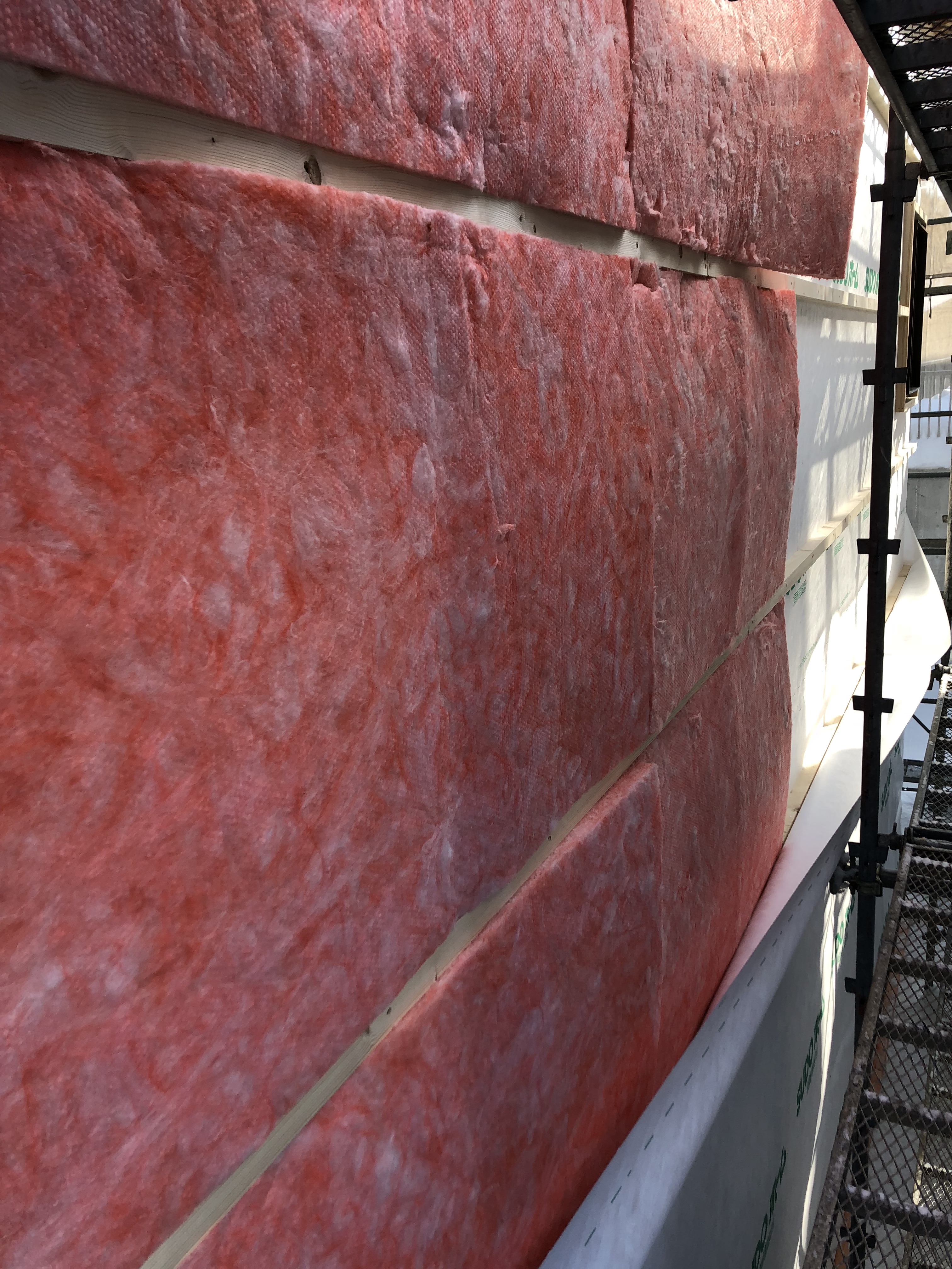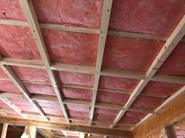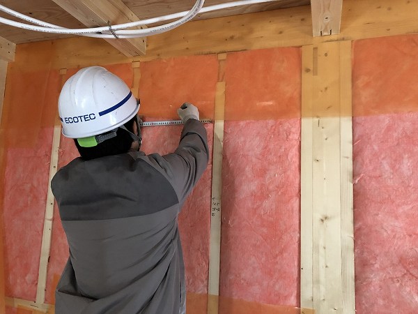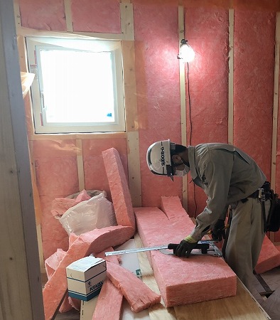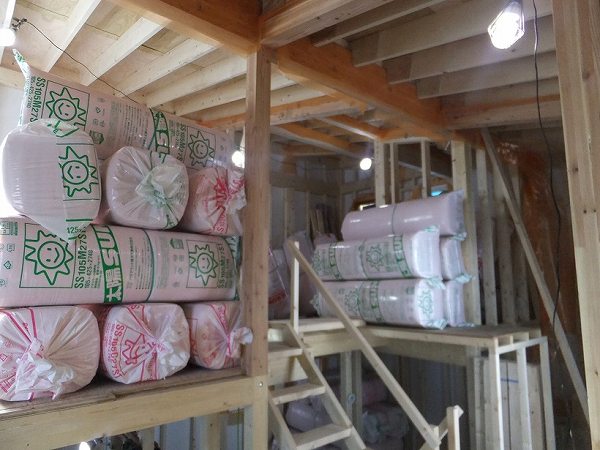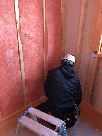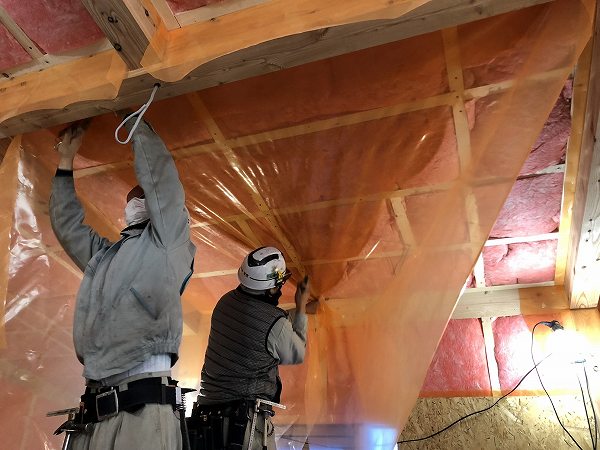 断熱材の充填が終わると気密シートにて処理をしていくので