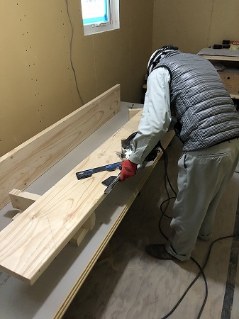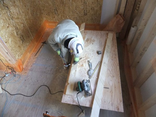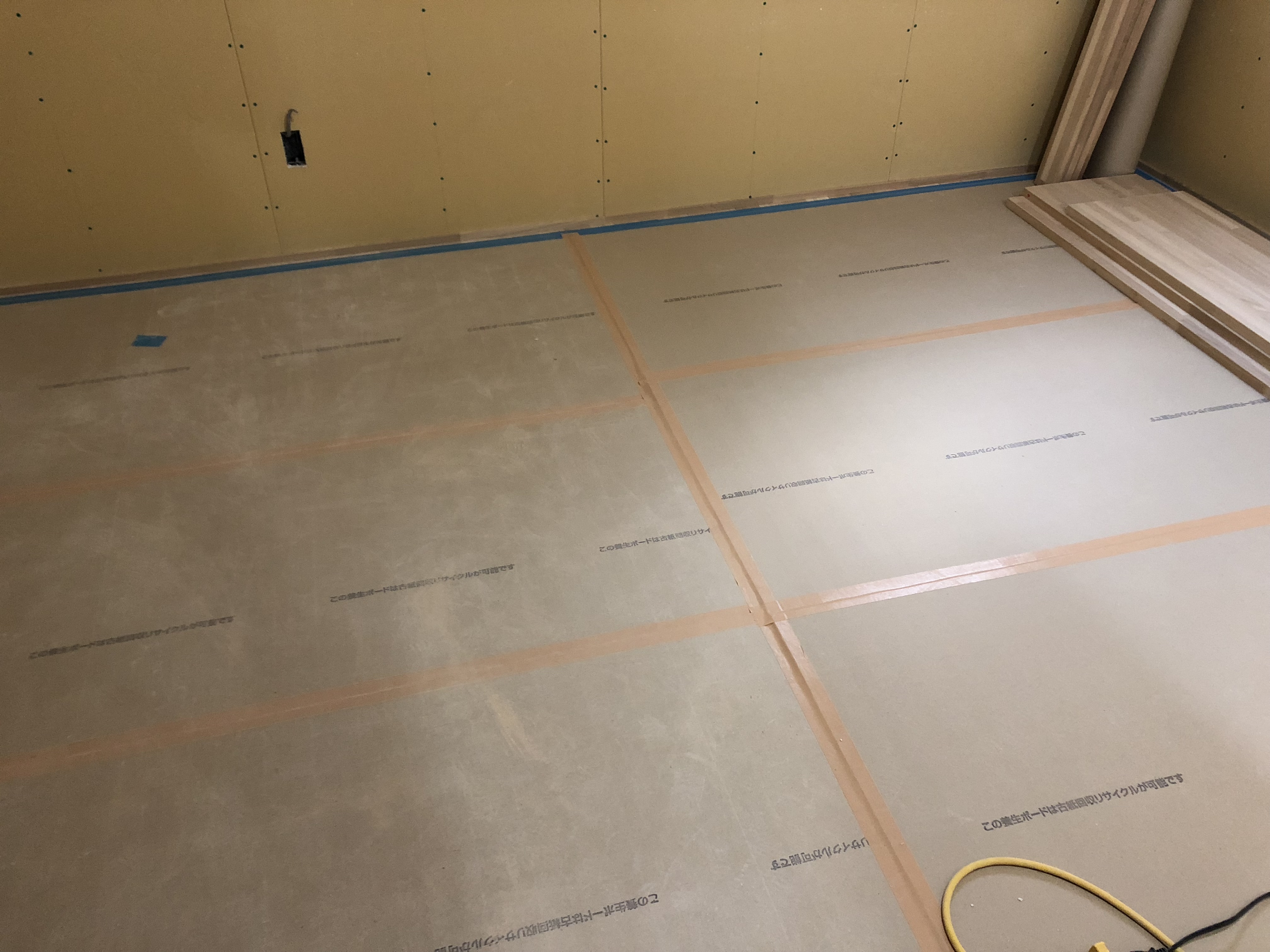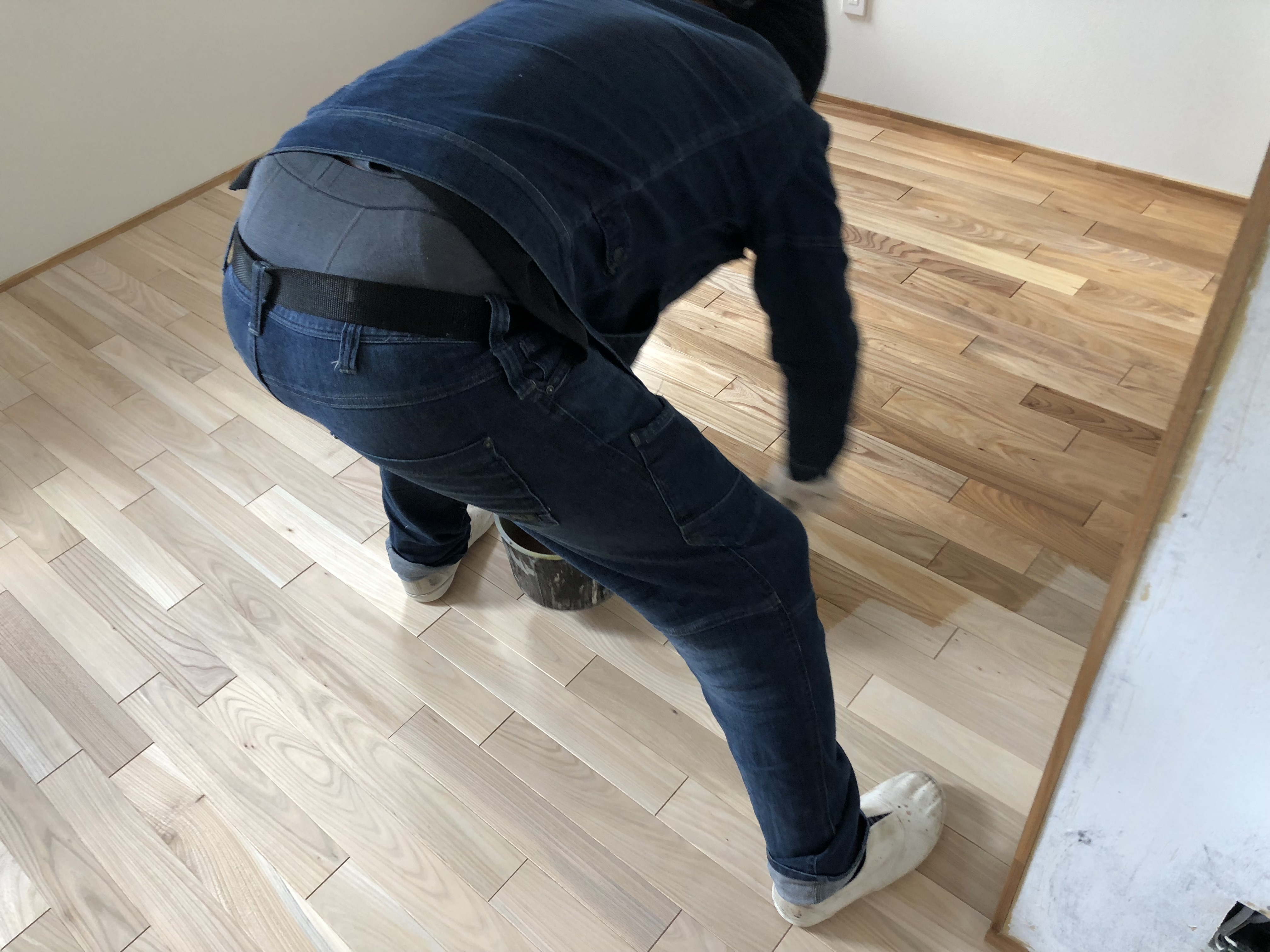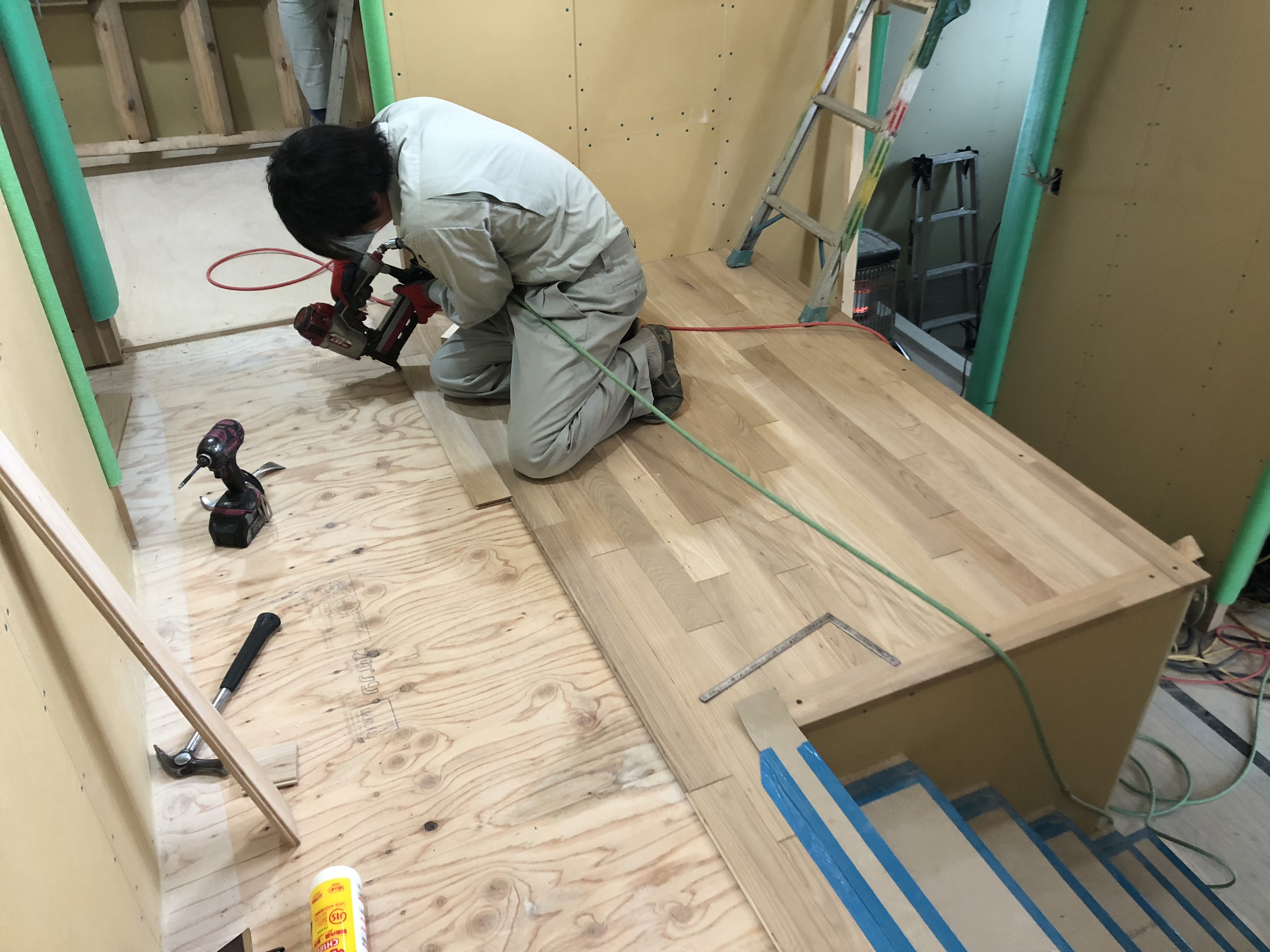 前回登場したフローリングをM口棟梁が早速張っていきます。