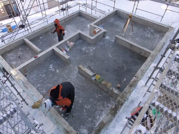 ブルーシートで養生はしていましたが所々雪が入っていたので雪かきや天端を溶かす作業からスタートです。