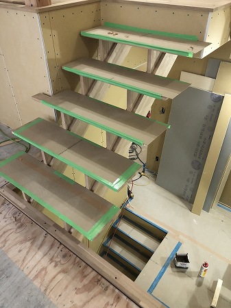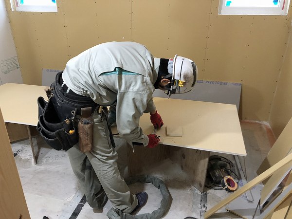 梁や開口など複雑な形もなんなく貼っていくT樫さん。