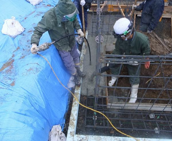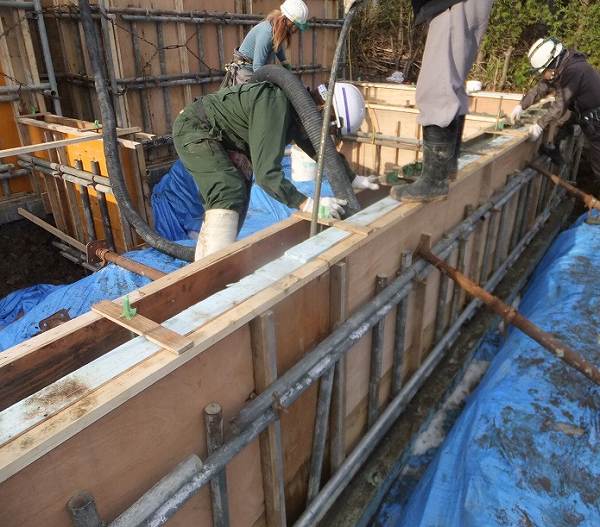 打設する人、振動機をかける人、天端をならす人など協力プレーで打設していきます。