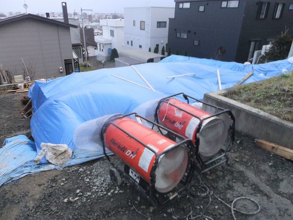 打設後はブルーシートでおおい、採暖しながらの養生です!