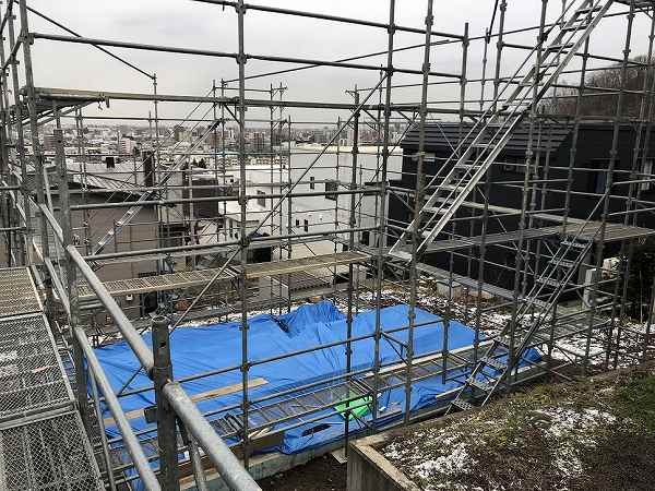 基礎工事が完了したので足場を架け、大工さんの乗り込みを待ちます。