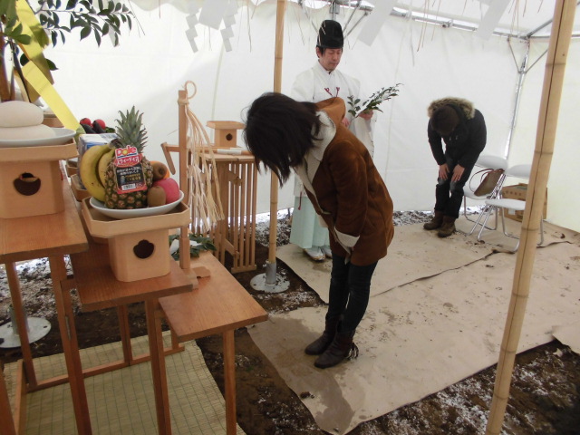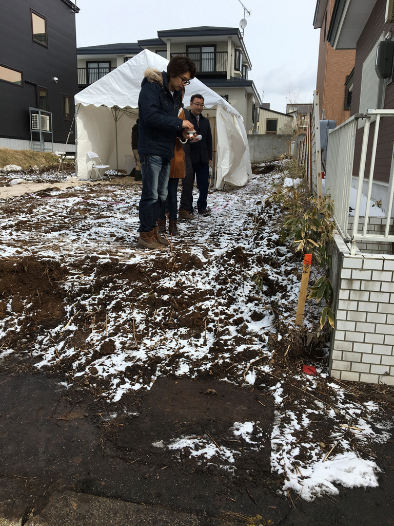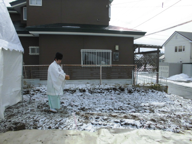 神主さんは祝詞奏上(のりとそうじょう)のあと敷地の四隅と中央に切麻(きりぬさ)をまき土地を清めています。