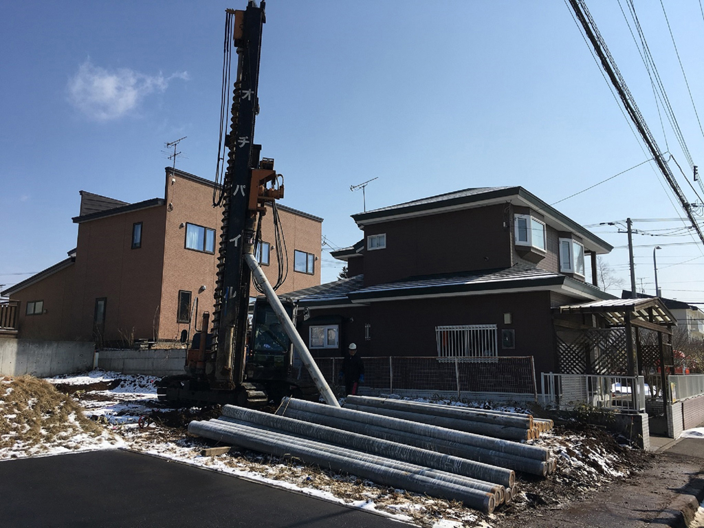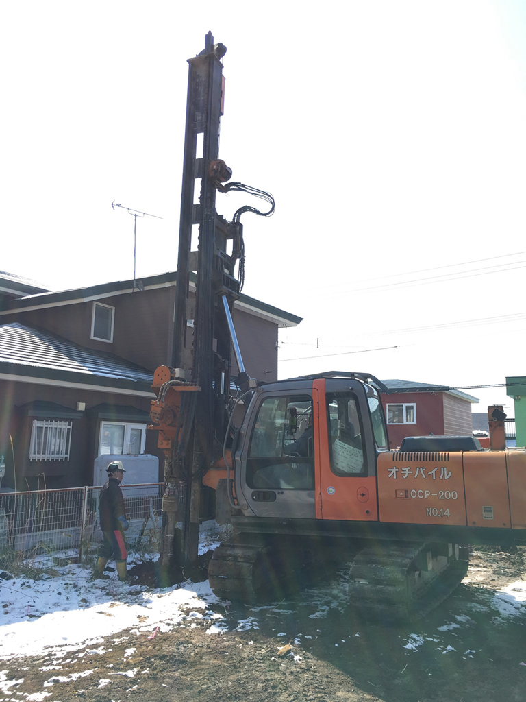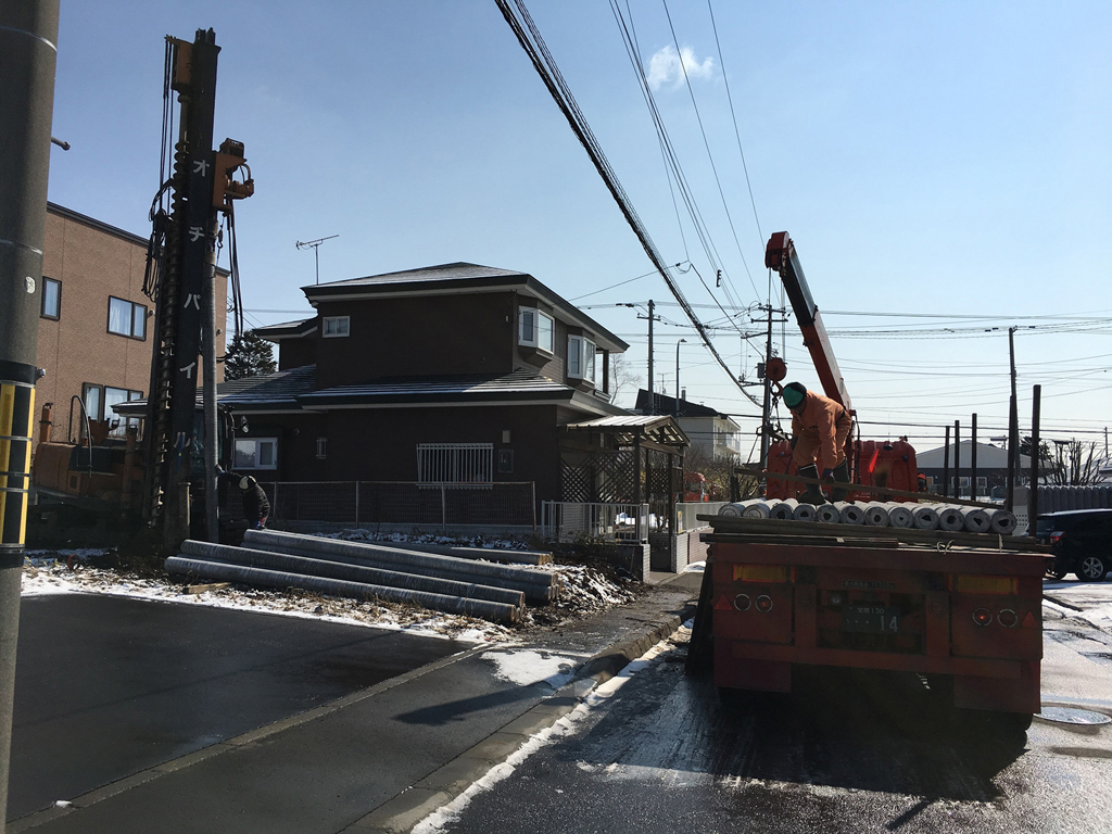 まずは地盤の改良工事をする為、長さ4.5m~6mのコンクリート杭を圧入していきます。