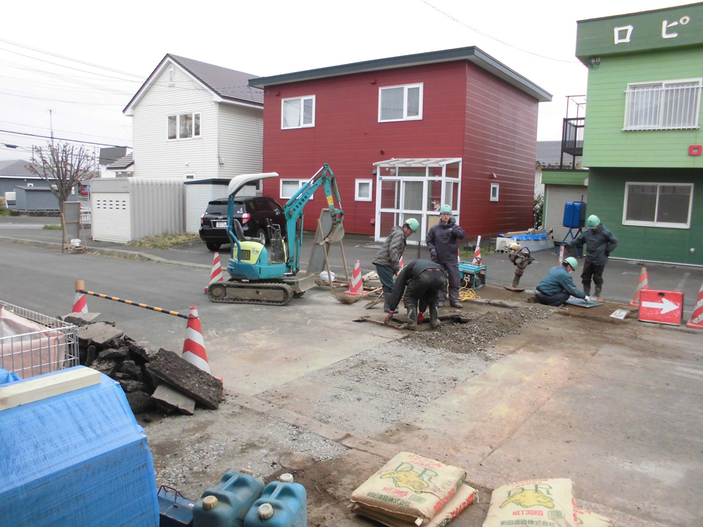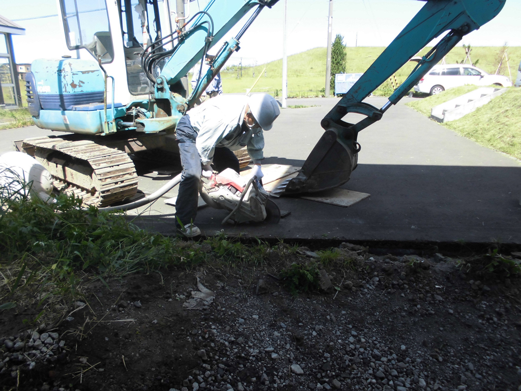 隣の方の了承を得て、工事の支障となる境界沿いの民地石を一時撤去し、アスファルトをカッターで切り丁寧に剥がします。