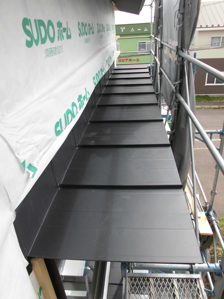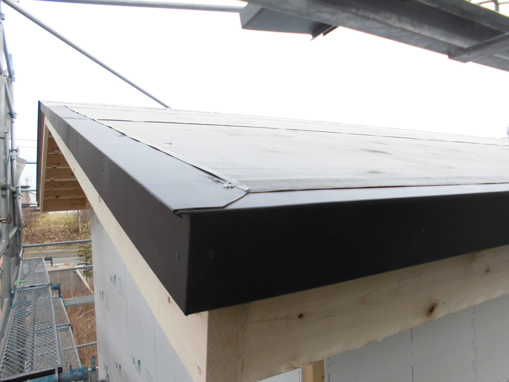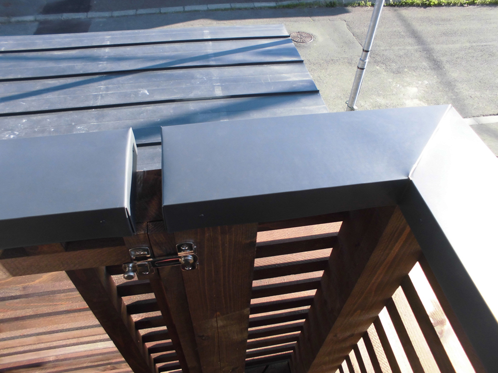 先ほどのデッキ手摺りの笠木に板金包みをして、板金屋さんの作業は全て完了致しました。