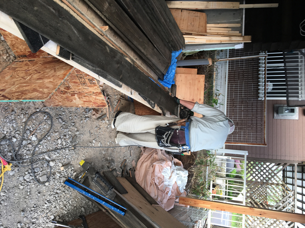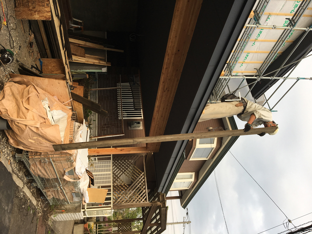 前回足場が解体されましたので、再びエスキ棟梁に来てもらい、デッキ造作をしました。