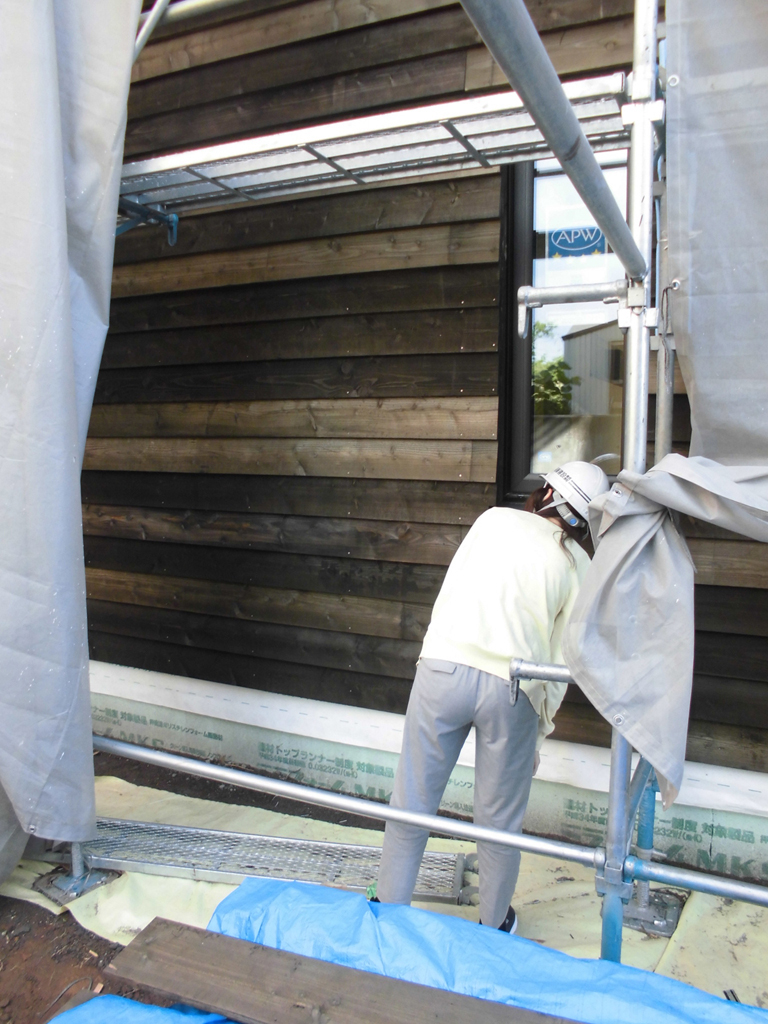 自然健康塗料リボスで木部を塗装中。