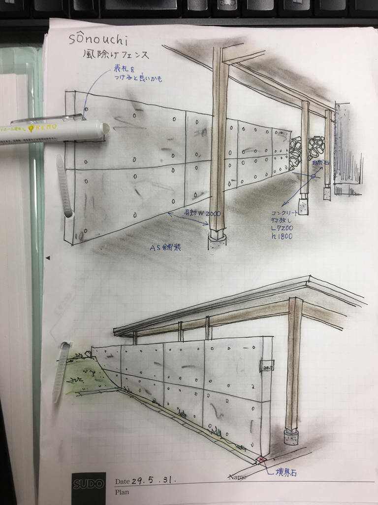 ということで5月の末頃オーナーさんより、アプローチ部分の風対策としてシンプルな塀の追加依頼がありましたので、こんな感じでご提案しました♪