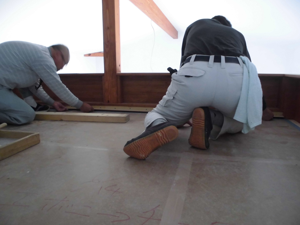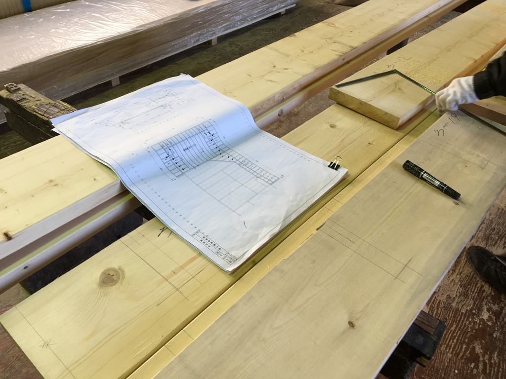 養生期間をおき、現場へ行きますと何やら職人さんが墨出しをしていました。