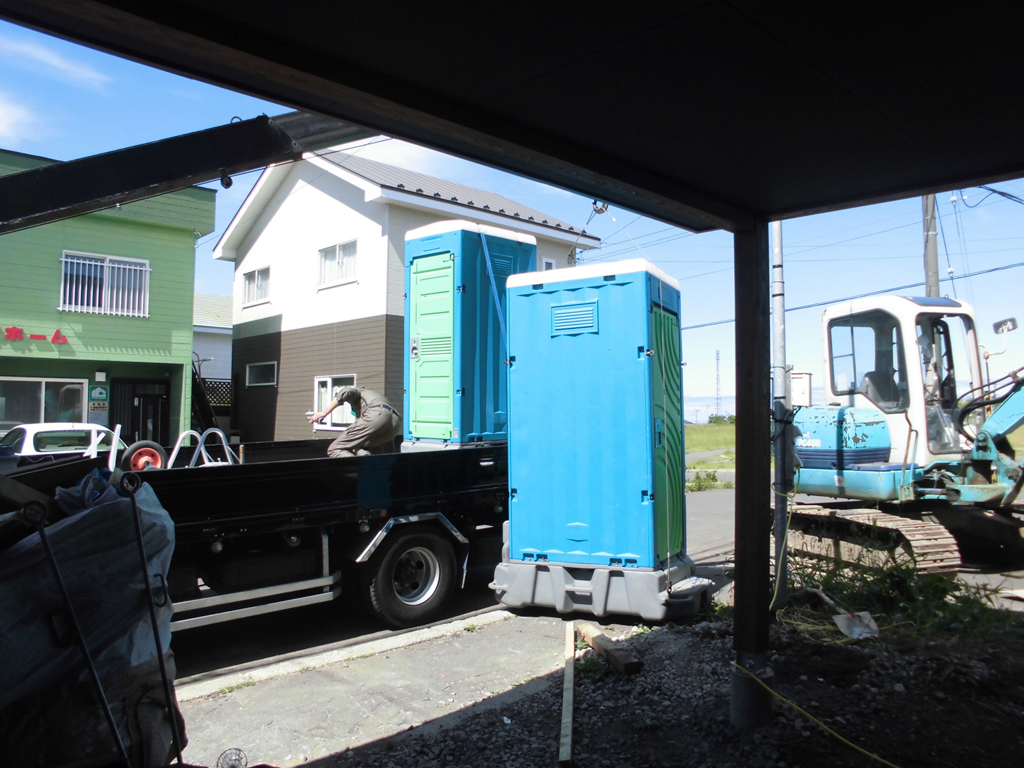 工事の邪魔になってしまうので、まずは仮設トイレを撤去します。