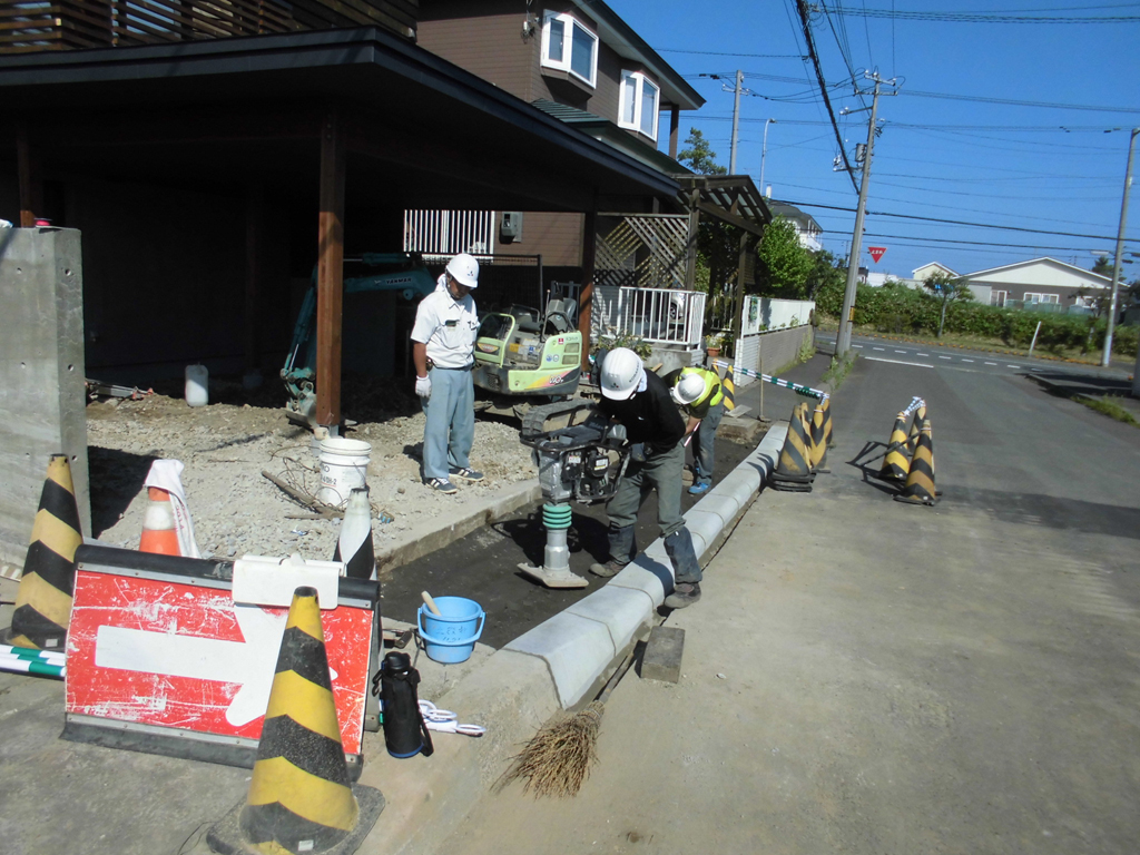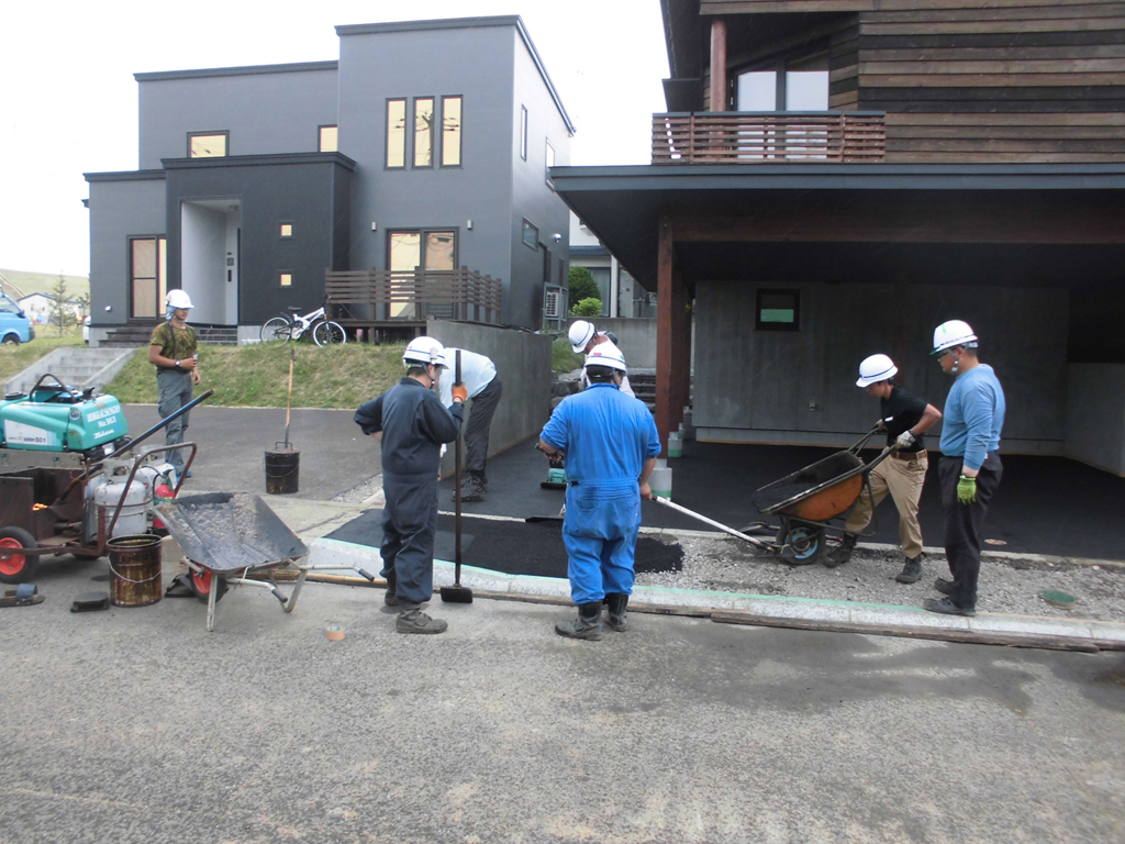 外部の最終仕上げはアスファルト舗装になります。それにしても作業員の