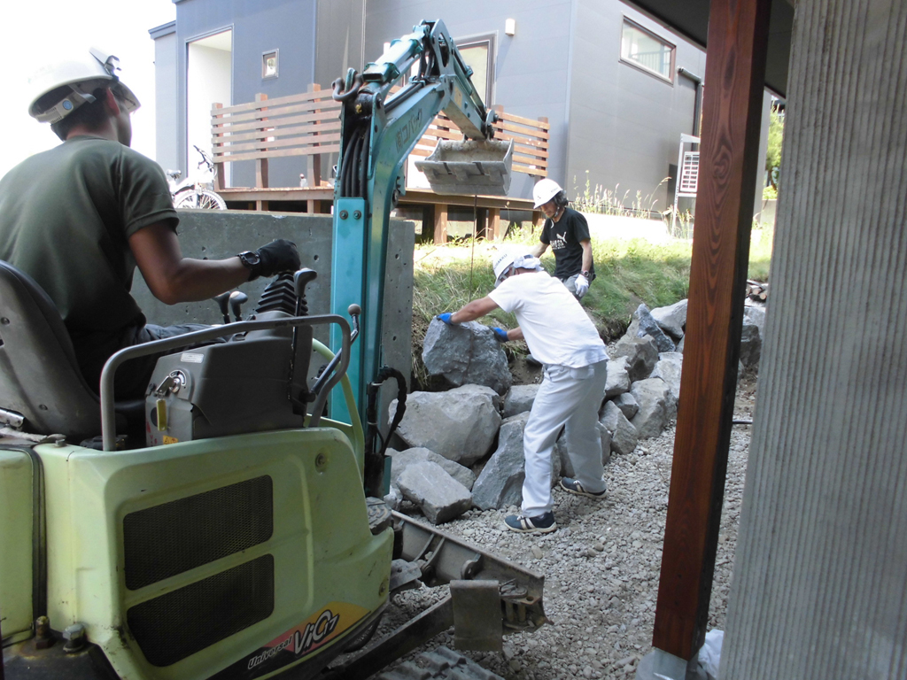 擁壁と隣の法面の取り合いの所に自然石を1個ずつ丁寧に積み上げていきます。