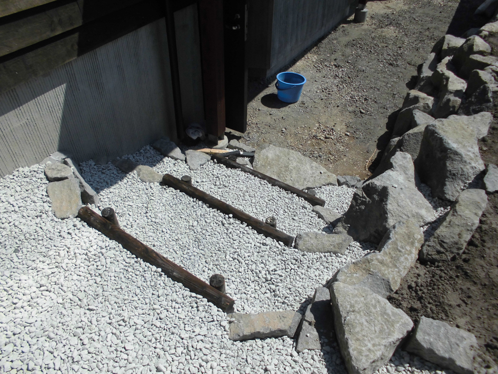 玄関付近は石積みと、丸太階段、化粧砂利により雰囲気が変わりました!