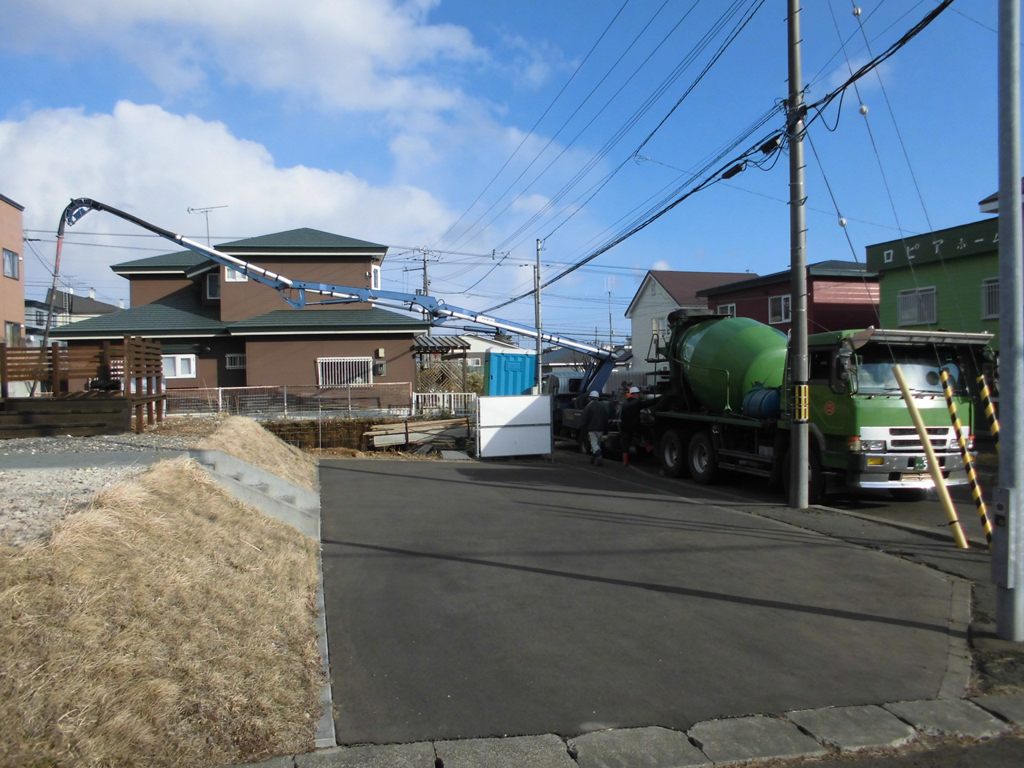 まずはベースコンクリートを打設していきます。天気も良好で問題ありません(^^♪