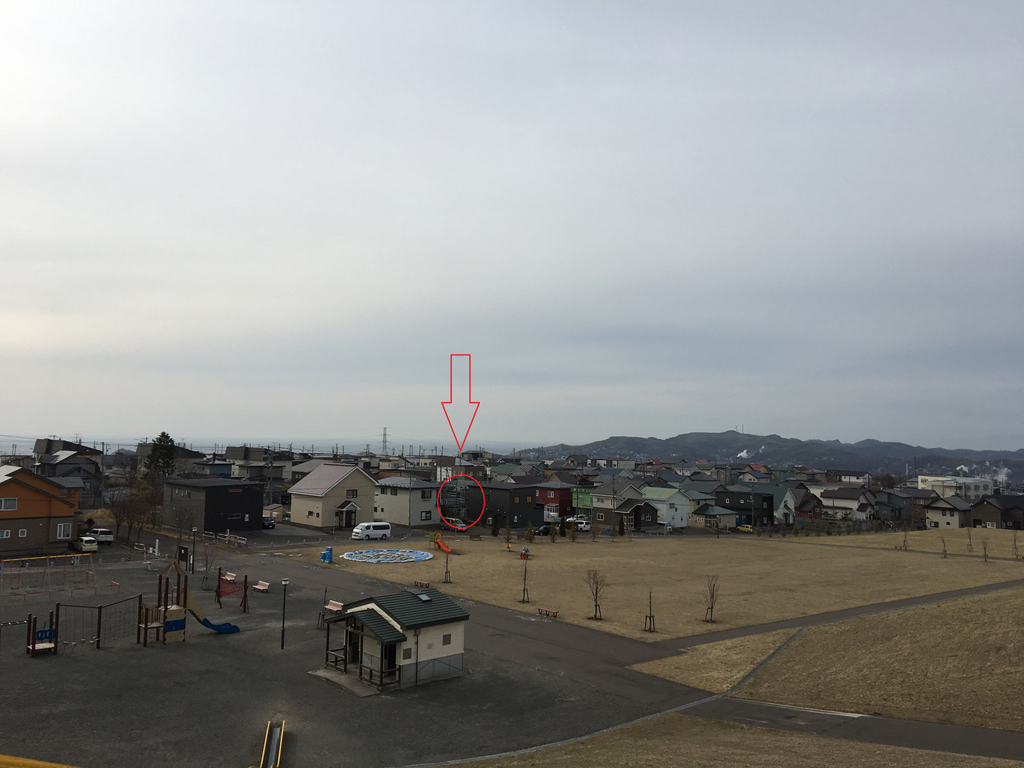 東西北と3方向とも家に囲まれた住宅地ですが、唯一抜けている南西方向にはこのマチの大人気公園があります。